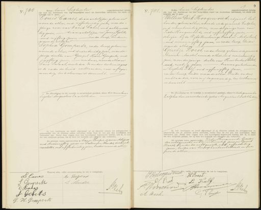 No. 780 Heden twee September negentienhonderd twintig zijn voor mij Ambtenaar van den burgerlijken stand van Amsterdam verschenen, ten einde een mynelijk aan te gaan: Louis Canes, diamantslijper, geboren en wonende alhier, oud vijfentwintig jaren, meerder - jarige zoon van David banes, oud achtenveer„ tig jaren — diamantslijper en Jansje Gobits, oud vijftig jaren, zonder beroep, beiden- wonende alhi en Sophia Gompertz zonder beroep, geboren en wonende alhier, oud drieentwintig jaren, meerder- jarige dochter van Gompel Haim Gompertz, oud vyftig jaren, — werkman, wonende alhier en Sara Swaab, overleden. De ouders des bruidegoms en de vader der bruid verklaarden, voor mij tegen- woordig, toe te stemmen in dezenrecht. De afkondiging tot dit huwelijk is onverhinderd geschied, alhier den eenen twin- tigsten Augustus laatstleden Ik heb bruidegom en bruid afgevraagd of zij elkander nemen tot echtgenooten en getrouwelijk alle de plichten zullen vervullen, welke door de wet aan den huwelijken stad verbonden zijn. Nadat deze vragen door hen bevestigend beantwoord werden, heb ik, in naa der wet, uitspraak gedaan, dat zij door het huwelijk aan elkander zijn verbonden. Als getuigen waren tegenwoordig: Aaron Zeeper, diamantslyper oud drieenvijftig jaren en Salomon Mendes, diamant- versteller, oud vijfentwintig jaren, beiden wonende alhier. reenkomstig de wet is voorge- No. 781. Heden twee September negentienhonderd twintig zijn voor mij Ambtenaar van den burgerlijken stand van Amsterdam verschenen, ten einde eer huwelijk aan te gaan: Willem Dirk Hoogewoud, adjunct-boek houder geboren alhier, wonende in de gemeente Zutphen, oud vierentwintig jaren, meerderjarige zoon van Pieter Hoogewoud, oud vijfenvijftig jaren schrijver bij de Rijks-Verzekerings. Bank en Antje Beek oud vierenvijftig jaren, — zonder beroep, beiden wonende alhier en Grietje Rolst, zonder beroep, geboren in de gemeent Nieuwer-Amstel, wonende alhier, oud vierentwintig jaren meerderjarige dochter van Huibertus Coest, oud zestig jaren — tramwagerbestuurder en Lijsbeth Kalf, oud vijfenvijftig jaren zonder beroep, beiden wonende alhier. Beider ouders verklaarden, voor mij tegenwoordig, toe te stemmen in dezen echt. De afkondiging tot dit huwelijk is onverhinderd geschied, alhier en in de gemeente Zutphen den eenentwintigsten Augustus laatstleden Ik heb bruidegom en bruid afgevraagd of zij elkander nemen tot echtgenooten en getrouwelijk alle de plichten zullen vervullen, welke door de wet aan den buwelijken staat verbonden zijn. Nadat deze vragen door hen bevestigend beantwoord werden, heb ik, in naam der wet, uitspraak gedaan, dat zij door het huwelijk aan elkander zijn verbonden. Als getuigen waren tegenwoordig: Pieter Hoogewoud, broeder des echtgenoots, oud eenentwintig jaren en Gerrit Roest, broeder der echtgenoote, oud vyfendertig jaren, beiden van beroepkantoorbediende en wo- nende alhier. L lares A: Peepers. S. Mendes. Gomertt D Ruines BJahi J: Gouts G. H. Gompertr Waarvan akte, welke overeenkomstig de wet is voorgelezen. J Biloojewond H Boest J: Vroest Le Kalf. Hooyenou Roogen Azahe G: Kloer A. Beek.