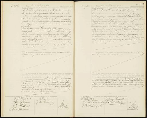 No. 7841 Heden twee September negentienhonderd twintig zijn voor mij Ambtenaar van den burgerlijken stand van Amsterdam verschenen, ten einde een huwelijk aan te gaan Albertus Johannes Revier, broodbak- ker, geboren in de gemeente Holder, wonende alhier, oud vierentwintig jaren, meerderjarige zoon van Albertus Johannes Revier, oud zevenenzestig jaren, —en Pieternella Thomasse, oud acht- enzestig jaren, — beiden zonder beroep en wonende alhier en Catharina Cornelia Huigen, zonder beroep, geboren en wonende alhier, oud drieentwintig jaren, meerderjarige dochter van Jan Huigen, overleden en Catharina Cornelia van Thienen, oud vijfenvijftig jaren, — schoonmaakster, wonende alhier. De ouders des bruidegomsen de moeder der bruid verklaarden, voor mij tegenwoordig, toe te stemmen in dezen echt- De afkondiging tot dit huwelijk is onverhinderd geschied, alhier den eenen twin- tigsten Augustus laatstleden. Ik heb bruidegom en bruid afgevraagd of zij elkander nemen tot echtgenooten en getrouwelijk alle de plichten zullen vervullen, welke door de wet aan den huwelijken staa verbonden zijn. Nadat deze vragen door hen bevestigend beantwoord werden, heb ik, in naar der wet, uitspraak gedaan, dat zij door het huwelijk aan elkander zijn verbonden Als getuigen waren tegenwoordig: Hendrik Revier, broeder des echtgenoots, magazijnknecht, oud negenendertig jaren, wonende te Helder en Jan Albartus Huigen, broeder der echtgenoote, broodbakker, oud vijf- en twintig jaren wonende alhier De moeder des echt- genoots verklaarde niet te kunnen naamteekenen. als hebbende geen schrijver geleerd. No. 785 Heden twee September negentienhonderd twintig zijn voor mij Ambtenaar van den burgerlijken stand van Amsterdam verschenen, ten einde ee huwelijk aan te gaan Hendrik Leendert Helwed, bankwer ker, geborenen wonende alhier, oud vijfentwintig jaren meerderjarige zoon van Hendrik Roelof Helweg, oud negenenzestig jaren, vuurstoker en Maria Hoenson, zonder beroep, beiden wonende alhier en Johanna de Hundt, zonder beroep, geboren en wonende alhier, oud eenentwintig jaren meerderja rige dochter van Johannes Egbert de Hundt en Hendrikje van den Berg, beiden overleden. De vader des bruidegoms verklaarde, voor mij tegenwoordig, toe te stemmen in dezen echt. De moeder desbruidegoms heeft, blijkens hierbij overgelegde authentieke akte, in dezen echt toegestemd. De afkondiging tot dit huwelijk is onverhinderd geschied, alhier den eenen twintig sten Augustus laatstleden Ik heb bruidegom en bruid afgevraagd of zij elkander nemen tot echtgenooten en getrouwelijk alle de plichten zullen vervullen, welke door de wet aan den buwelijken staat verbonden zijn. Nadat deze vragen door hen bevestigend beantwoord werden, heb ik, in naam der wet, uitspraak gedaan, dat zij door het huwelijk aan elkander zijn verbonden Als getuigen waren tegenwoordig: Johannes Egtbertus de Hundt, broeder der echtgenoote, machnist, oud drie en der- tig jaren en Jacob Nicolaas Pietes Helweg, broeder des echtgenoots molenaarskrecht, oud vijfentwintig jaren, beiden wonende alhier Waarvan akte, welke overe tig de wet is voorgelezen. A.J. Revie H Reuis. C.C. Huiger J: H Huiger J Revier Aaker C C v Thienen Waarvan akte, welke overeenkomstig de wet is voorgelezen Wd Helweg J. E. de Hundt J. Te Hundt, JP.J. Helweg H D Helwtjn O PZahy