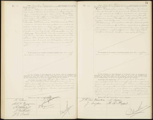 No. 131. Heden zeventien Februari negentienhonderd een en twintig zijn voor mij Ambtenaar van den burgerlijken stand van Amsterdam verschenen, ten einde een huwelijk aan te gaan: Anton Rlem, broodbakker, geboren en wonende alhier, oud twee en twintig Ja- „ren, meerderjarige zoon van Zweitze Rlem, oud negen en veertig jaren, sla- „ger, wonende alhier en Wilhelmina Geertrui„ „da Lefeber, overleden en Mina Wilhelmina Wilhermina Bier, „ man, zonder beroep, geboren en wonende alhier, oud twee en twintig jaren, meerder „jarige dochter van Jacob Bierman, oud negen en veertig jaren, kleermaker, en Jo „hanna Elisabeth Oml, oud drie en vijf tig jaren, zonder beroep, beiden wonende alhier. De vader des bruidegoms en de ouders der bruid verklaarden, voor mij tegenwoordig, toe te stemmen in dezen exhb. De afkondiging tot dit huwelijk is onverhinderd geschied, alhier den vijf- den dezer maand Ik heb bruidegom en bruid afgevraagd of zij elkander nemen tot echtgenooten en getrouwelijk alle de plichten zullen vervullen, welke door de wet aan den huwelijken staat verbonden zijn. Nadat deze vragen door hen bevestigend beantwoord werden, heb ik, in naam der wet, uitspraak gedaan, dat zij door het huwelijk aan elkander zijn verbonden. Als getuigen waren tegenwoordig: Pieter Jan Rlen, broe¬ der des echtgenoots, boekhouder oud vijf en twintig jaren en Nicolaas Bierman, broeder der echtgenoote, kantoorbediende, oud een en twintig jaren, beiden wonende alhier Waarvan akte, welke overeenhomen betvet is oorgelezen. No. 132 Heden zeventien Februari negentienhonderd een en twintig zijn voor mij Ambtenaar van den burgerlijken stand van Amsterdam verschenen, ten einde een huwelijk aan te gaan: Jan Klaassen van Reulen, leerbewer ker, geboren in de gemeente Haarlemmer meer, wonende alhier, oud een en veertig jaren, meerderjarige zoon van Jacob Eersen van Keulen en Antje de Ruijter beiden overleden en Johanna Snijders, zonder beroep; gebo „ ren en wonende alhier, oud drie en dertig jaren, meerderjarige dochter van Tijmer Snijders melkslijter en Trijntje Rol, zonder beroep, beiden wonende alhier. De afkondiging tot dit huwelijk is onverhinderd geschied, alhier den vijfden dezer maand Ik heb bruidegom en bruid afgevraagd of zij elkander nemen tot echtgenooten en getrouwelijk alle de plichten zullen vervullen, welke door de wet aan den huwelijken staat verbonden zijn. Nadat deze vragen door hen bevestigend beantwoord werden, heb ik, in naam der wet, uitspraak gedaan, dat zij door het huwelijk aan elkander zijn verbonden. Als getuigen waren tegenwoordig: Arie Snijders, broeder der echtgenoote, tramwagenbestuder, oud zeven en dertig jaren en Herman Heinrich Pieper, zwager des echtgenoots, commissionnai in g sporitualien, oud zeven en vijftig jaren, beiden wonende alhier. goedgekeurd de doorha ling van een geschreven letter in den vijf en twin tigsten regel van boven. Waarvan akte, welke overeenkomstig de wet is voorgelezen. A. Klein D: M. W.W. Bierman. J. Beerwan KVeiss
