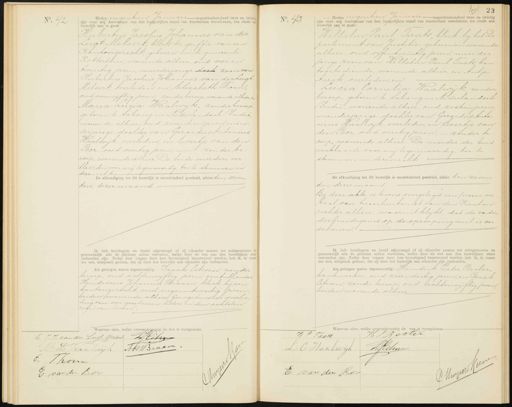 No. 42 Heden negentien Januari negentienhonderd twee en twin zijn voor mij Ambtenaar van den burgerlijken stand van Amsterdam verschenen, ten einde en huwelijk aan te gaan Rubertus Jacobus Johannes van der Lugt Melsert, klerk ter griffie van een Kantongerecht, geboren in de gemeente Rotterdam, wonende alhier, oud vier en twintig jaren, meerderjarige doch zoon van Hubertus Jacobus Johannes van der Lugt Melsert, overleden, en Elizabeth Thorn„ oud vierenvyftig jaren, zonder beroep, wonende alhier, en Maria Lucia Waalwijk, zonder beroep geboren te Sabang in Nederlandsch. Indie wonende alhier, oud zeventien jaren, min- derjarige dochter van Gerardus Antonius Waalwijk, overleden, en Evertje van den Bor, oud veertig jaren, — zonder be roep, wonende alhier. De beide moeders ver klaarden voor mij tegenwoordig, toe te stemmen in dezen echt. De afkondiging tot dit huwelijk is onverhinderd geschied, alhier den Zeven den, dezer maand Ik heb bruidegom en bruid afgevraagd of zij elkander nemen tot echtgenooten en getrouwelijk alle de plichten zullen vervullen, welke door de wet aan den huwelijken stad verbonden zijn. Nadat deze vragen door hen bevestigend beantwoord werden, heb ik, in naam der wet, uitspraak gedaan, dat zij door het huwelijk aan elkander zijn verbonden. Als getuigen waren tegenwoordig: Izaak Citroen, zonder beroep, oud achtenvijftig jaren, en Anthonius Hendricus Johannes Braam klerk bij een kantongerecht, oud negenentwintig jaren beiden wonende alhier Goedgekeurd de doorha ling van vier geschreven letters in den achtsten regel van toven Waarvan akte, welke overeenkomstig de wet is voorgelezen. No. 43 Heden negentien Januari negentienhonderd twee en twintig zijn voor mij Ambtenaar van den burgerlijken stand van Amsterdam verschenen, ten einde een huwelijk aan te gaan Wilhelm Paul Taats, klerk bij het De partement van Justitie, geboren en wonend alhier, oud vijfentwintig jaren, meerder jarige zoon van Wilhelm Paul Taats, kan toorbediende, wonende alhier, en Antje Aurik, overleden, en Lucia Cornelia Waalwyk zonder beroep, geboren te Sabang in Nederlandsch Indie, wonende alhier, oud zestien jaren minderjarige dochter van Gerardus Anto„ nius Waalwijk, overleden, en Evertje van den Bor, oud veertig jaren, — zonder be roep, wonende alhier. De moeder der bruid verklaarde voor mij tegenwoordig, toe te stemmen in dezen echt. De afkondiging tot dit huwelijk is onverhinderd geschied, alhier ten zeven den, dezer maand Bij deze akte is tevens overgelegd een proces- ver baal van tusschenkomst van den Kanton rechter alhier, waaruit blijkt, dat de vader desbruidegoms op de oproeping niet is ver schenen. Ik heb bruidegom en bruid afgevraagd of zij elkander nemen tot echtgenooten en getrouwelijk alle de plichten zullen vervullen, welke door de wet aan den buwelijken staat verbonden zijn. Nadat deze vragen door hen bevestigend beantwoord werden, heb ik, in naam der wet, uitspraak gedaan, dat zij door het huwelijk aan elkander zijn verbonden. Als, getuigen waren tegenwoordig: Hendrik Pieter Beeler bankwerker, oud zesendertig jaren, en Izaak Citroen zonder beroep oud achtenvijftig jaren, beiden wonende alhier H.J.J. van der Lugl Medert DEitze AotBraam. A: L Waalwijk E. Jhon E van der Bor N7
