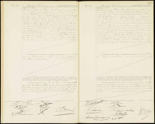 No. 210 Heden vier April negentienhonderd twee en twintig zijn voor mij Ambtenaar van den burgerlijken stand van Amsterdam verschenen, ten einde een huwelijk aan te gaan: Laurens Jan de Ven civiel- ingenieur, gebo„ ren in de geureente Gouda, wonende in de ge meente Rotterdam oud dertig jaren meerderjari ge zoon van Jan de Ten, boekhandelaar en Eli sabeth Schuijt Best, zonder beroep, beiden wo nende in de gemeente Gouda en Antoinetta Groot zonder beroep, geboren en wonende alhier oud vier en twintig jaren meerderjarige dochter van Jan Groot, oud vier en vyftig jaren, — accountant en Catharina Francina Laterveer, oud een en vijftig jaren, zonder beroep, beiden wonende alhier. De ouders der bruid verklaarden, voor mij tegenwoordig toe te stemmen in dezen echt De afkondiging tot dit huwelijk is onverhinderd geschied, alhier en in de ge meenten Rotterdam en Koermond, den achttien den Maart laatstleden Ik heb bruidegom en bruid afgevraagd of zij elkander nemen tot echtgenooten en getrouwelijk alle de plichten zullen vervullen, welke door de wet aan den huwelijken staat verbonden zijn. Nadat deze vragen door hen bevestigend beantwoord werden, heb ik, in naam der wet, uitspraak gedaan, dat zij door het huwelijk aan elkander zijn verbonden. Als getuigen waren tegenwoordig: Jan de Ven, vader des echt„ genoots boekhandelaar, oud acht en zestig jaren wonende in de gemeente Goudd en Pieter Jacobus Groot broeder der echtgenoote, zonder beroep, oud drie en twintig jaren, wonende te Rotterdam. No. 211 110 Heden vier April negentienhonderd twee en twintig zijn voor mij Ambtenaar van den burgerlijken stand van Amsterdam verschenen, ten einde een huwelijk aan te gaan: Willem van Creveld koopman, geboren en wonende alhier oud vif en twintig jaren meerderjarige zoon van Abraham van Cre veld, oud twee en zestig jaren, uitgever van boekwerken en Hemtje Bos oud vier en zestig jaren, zonder beroep beiden wonen de alhier en Saline Levie, zonder beroep, geboren in de gemeente Groningen, wonende alhier, oud twee en twintig jaren, meerderjarige dochter van Alexander Levie, oud vijftig jaren, fabrikant en Mathilda de Lange, opd zes en veertig jaren, zonder beroep, beiden wo nende alhier. Beider ouders verklaarden, voor mij tegenwoordig, toe te stemmen in dezen echt De afkondiging tot dit huwelijk is onverhinderd geschied, alhier den achttien den Maart laatstleden Ik heb bruidegom en bruid afgevraagd of zij elkander nemen tot echtgenooten en getrouwelijk alle de plichten zullen vervullen, welke door de wet aan den huwelijken staan verbonden zijn. Nadat deze vragen door hen bevestigend beantwoord werden, heb ik, in naam der wet, uitspraak gedaan, dat zij door het huwelijk aan elkander zijn verbonden. Als getuigen waren tegenwoordig: Louis Levie, oom der echtge noote fabrikant, oud twee en vijftig jaren en Martin van Creveld broeder des echtgenoots, koop man, oud vier en dertig jaren beiden wonende alhier rvan akte, welke overeenkomstig de wet is voorgelezen. J Ja Ver deven A. Groot Brevee 2 J Katerveer Haamlemene een de nk tren. H Bos A Leve 9 M: Ledvie- de Lange S. Levie 70 Khevir A van Creveedinn ot