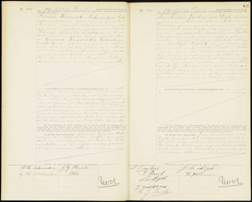 No. 200 Heden dertig Maart negentienhonderd twee en twint zijn voor mij Ambtenaar vanden burgerlijken stand van Amsterdam verschenen, ten einde ee huwelijk aan te gaan. Berend Heinrich Schroeder, labo ratoruumbediende, geboren in de gemeente Haarlem, wonende alhier, oud een en veer„ tig jaren, meerderjarige zoon van Berend Heinrich schroeder, overleden, en Elisa beth Lazones, zonder beroep, wonende alhier en Gesina Hendrika Helmken, zonder beroep, geboren en wonende alhier oud drie en dertig jaren, van echt ge scheiden echtgenoote van Sijje Nauta meerderjarige dochter van Jan Dirk Helmken, en Gesina Hendrika Kolwij beiden zonder beroep, en wonende alhier De afkondiging tot dit huwelijk is onverhinderd geschied, alhier den acht tienden dezer maand De bruidegom verklaarde met toestemming der moeder- bruid bij deze te erkennen een- kind, genaamd Bernardus Relmken, al hier geboren op drie en twintig Juli ne gentienhonderd tien, zijnde dit kind reeds door de moeder erkend bij akte van zestien Augustus negentienhonderd tien, verleden door den Ambtenaar van den Burgerlijken stand alhier Ik heb bruidegom en bruid afgevraagd of zij elkander nemen tot echtgenooten en getrouwelijk alle de plichten zullen vervullen, welke door de wet aan den huwelijken staan verbonden zijn. Nadat deze vragen door hen bevestigend beantwoord werden, heb ik, in naam der wet, uitspraak gedaan, dat zij door het huwelijk aan elkander zijn verbonden. Als getuigen waren tegenwoordig: Johannes Gerardus Huile zwager der echtgenoote, boekbinder, oud drie en veertig jaren, en Bernard Vos winkelier, oud vijf en veertig jaren beiden wonende alhier No. 201 dertig Maart negen rd twee en twintig zijn voor mij Ambtenaar van den burgerlijken stand van Amsterdam verschenen, ten einde een huwelijk aan te gaan: Lambertus Jacobus van Dijk, Mectriuiës geboren en wonende alhier, oud vier en twintig jaren, meerderjarige zoon van Lammert van Dijk, oud vijf en vijftig jaren, aardappelenhandelaar, en Jacobo Laagsma, oud vier en vijftig jaren zonder beroep, beiden wonende alhier en Neeltje Breek, zonder beroep, ge boren in de gemeente Broek in Water land, wonende alhier, oud zes en twin tig jaren, meerderjarige dochter van Klaas Jacob Breek, oud drie en vijftig jaren, agent van politie, wonende alhier en Antje Maries, overleden. De ouder des bruidegoms en de vader der bruid verklaarden voor mij tegenwoordig toe te stemmen in dezen echt. De afkondiging tot dit huwelijk is onverhinderd geschied, alhier den acht tienden dezer maand Ik heb bruidegom en bruid afgevraagd of zij elkander nemen tot echtgenooten en getrouwelijk alle de plichten zullen vervullen, welke door de wet aan den huwelijken staat verbonden zijn. Nadat deze vragen door hen bevestigend beantwoord werden, heb ik, in naam der wet, uitspraak gedaan, dat zij door het huwelijk aan elkander zijn verbonden. Als getuigen waren tegenwoordig: Jan Lambertus van Dijk broeder des echtgenoots, winkel knecht, oud acht en twintig jaren en Hendrik Roeman, agent van politie oud zeven en twintig jaren, beiden wonende alhier Waarvan akte, welke overeenkomstig de wet is voorgelezen. B.H. SchroederJ. G. Huile BVos G. H. Helmken Levol Waarvan akte, welke overeenkomstig de wet is voorgelezen. L. J. van Dijk J.L. vd Jk N Breek J Koeman LvDih leool J Lauysma K.J Breek