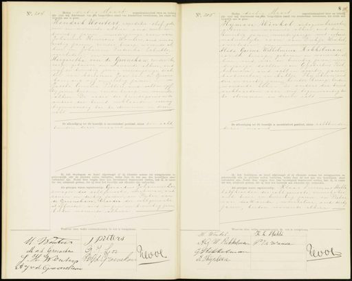 No. 204 ai negentienhonderd twee en twintig Heden dertig zijn voor mij Ambtenaar van den burgerlijken stand van Amsterdam verschenen, ten einde een huwelijk aan te gaan: Hendrik Wouters, expeditie chef, gebo ren en wonende alhier, oud zeven en twintig jaren, meerderjarige zoon van Johannes Henricus Wouters, oud vier en zestig jaren, zonder beroep, wonende al„ hier, en Johanna Frederika Schutte, overleden, en Margaretha van de Groenekan, zonder be„ roep, geboren en wonende alhier, oud vijf en twintig jaren, meerderjarige doch ter van Adrianus Jan van de Groene„ kan, oud vijf en zestig jaren, in Jacoba Cornelia Pitters, oud acht en vijf„ tig jaren, beiden zonder beroep, en wonende alhier. De vader des bruidegoms en de ouders der bruid verklaarden voor mij tegenwoordig toe te stemmen in dezen icht De afkondiging tot dit huwelijk is onverhinderd geschied, alhier den acht„ tienden dezer maand Ik heb bruidegom en bruid afgevraagd of zij elkander nemen tot echtgenooten en getrouwelijk alle de plichten zullen vervullen, welke door de wet aan den huwelijken staat verbonden zijn. Nadat deze vragen door hen bevestigend beantwoord werden, heb ik, in naam der wet, uitspraak gedaan, dat zij door het huwelijk aan elkander zijn verbonden. Als getuigen waren tegenwoordig: Gerardus Johannes Lor zwager des echtgenoots, werkman, oud zeven en dertig jaren, en Pieter van de Groenekan, broeder der echtgenoote stoffeerder, oud negen en twintig jaren beiden wonende alhier Waarvan akte, welke overeenkomstig de wet is voorgelezen. No. 205 Heden dertig Maart negentienhon e en twintig zijn voor mij Ambtenaar van den burgerlijken stand van Amsterdam verschenen, ten einde eer huwelijk aan te gaan: Hijman Winkel, antogeenlasscher geboren en wonende alhier, oud drie en twintig jaren, meerderjarige met - erkend natuurlijke zoon van Dirkje Winkel overleden, en Alida Gesina Wilhelmina Rikkelman, zonder beroep, geboren en wonende al hier, oud vier en twintig jaren, meer derjarige dochter van Gysbertus Rik helman, oud acht en veertig jaren bootwerker, en Aaltje Thijnbeen, oud drie en veertig jaren zonder beroep, beiden wonende alhier. De ouders der bruig verklaarden voor mij tegenwoordig toe te stemmen in dezen echt De afkondiging tot dit huwelijk is onverhinderd geschied, alhier achttiende dezer maan Ik heb bruidegom en bruid afgevraagd of zij elkander nemen tot echtgenooten en getrouwelijk alle de plichten zullen vervullen, welke door de wet aan den buwelijken staat verbonden zijn. Nadat deze vragen door hen bevestigend beantwoord werden, heb ik, in naam der wet, uitspraak gedaan, dat zij door het huwelijk aan elkander zijn verbonden. Als getuigen waren tegenwoordig: Klaas Lurinus Stahle halfbroeder des echtgenoots, vuurstoker oud twee en twintig jaren, en Piete van der Woude, winkelier, oud dertig jaren, beiden wonende alhier H. Wauter Piters M v.d Groenekan JJ. dO J. H: Wouters Bid Groenekan 15 AJ vd Groeirckom Waarvan akte, welke overeenkomstig de wet is voorgelezen. H. Winkel K K. Fahli A G.W Rikkelman P Jd Wande G Rikkelman Levol 3 A Thijnbeen.