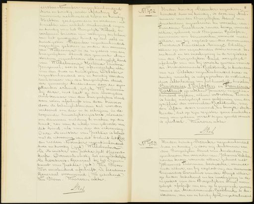 eersten November negentienhonderd twee en twintig, eerste Afdeeling C nummer achthonderd zeven en twintig Hebben goedgevonden en verstaan: uit krachte van artikel driehonderd negen en twintig van het Burgerlijk Wetboek te verleenen biieven van wettiging ten behoeve van het genoemde kind op den acht en twintigsten December negentienhonderd negentien geboren en onder den voormaam van Willemina in de registers van den burgerlijken stand der gemeente Amsterdam ingeschreven als natuurlijk kind van Wilhelmina Helena Paulina Jongeneel; voorts bij afzonderlyke akte van den twee en twintigsten October negentienhonderd een en twintig voor den ambtenaar van den burgerlijken stand der gemeente Amsterdam door de supplanten erkend, gelijk Wij verleenen bij deze, met last op den bevoegden ambtenaar van den burgerlijken stand aan wien afschrift van deze brieven door de belanghebbenden zal worden vertoond om die in te schrijven in de loopende huwelijksregisters, als mede om daarvan melding te maken op den kant zoo van de akte van geboorte van dit kind, als van die der erkenning Onze Mnister van Justitie is belast met de uitvoering van dit besluit het Roo den zesden November negentienhonderd twee en twintig (get.) Wilhelmina De Minister van Justitie, get/ Heemskerk. Overeenkomstig het oorspronkelijke De Secretaris -Generaal bij het Departement van Justitie (get:) Van Blom Voor eensluidend afschrift, De secretarisGeneraal voornoemd. (Was geteekend Van Blom. Waarvan akte. ABZah N:o 453. Heden twintig December negentien honderd twee en twintig, is door mij Ambtenaar van den Burgerlijken Stand van Amsterdam ingeschreven ten verzoeke van Francina Casthuis, zonder beroep, wonende alhier, gehuwd met Benjamin Goelofsen, aannemer van bouwwerken wonende medealhier, een bij exploit van den deurwaarder Theodorus Franciscus Menagé Challa alhier op den negentienden dezer maand beteekend en ter inschrijving in de registers van den Burgerlijken stand overgelegd afschrift van een bij verstek gewezen vonms der Arrondissements- Pechtbank te Amsterdam van zes October negentienhonderd twee en twintig waarbij is uitgesproken de ontbinding door echtscheiding van het huwelijk tusschenBenjamin Goelofsen en Francina Kasthuis op veertien Januari negentienhonderd vijftien, alhier voltrokken. Tevens is hierbij overgelegd eene verklaring van den griffier der voormelde Vechtbank, van den elfden dezer maand, ten bewize strek kende, dat op zijn register geene aanteekening van gedaan verzet tegen gemeld vonnis is geschied. Waarvan akte ABZak Heden twintig December negentienhonderd twee en twintig, is door mij Ambtenaar van den Burgerlijken stand van Amsterdam ingeschreven ten verzoeke van: Johanna Dekker zonder beroep, wonende alhier, gehuwd met Johannes Tuimman, bootwerker, wonende mede alhier, een bij exploit van den deurwaarde Heonardus Cornelius van der Duys alhier op heden beteekend en ter mschrijving in de registers van den Burgerlijk en stand overgelegd afschrift van een op tegenssraak gewezen vonnis der Arrondissements-Jechtbank te Amsterdam, van een en twintig April negentienhonderd