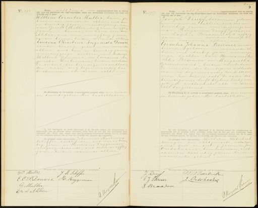 No. 396 Heden acht Juni negentienhonderd twee en twintig zijn voor mij Ambtenaar van den burgerlijken stand van Amsterdam verschenen, ten einde een huwelijk aan te gaan: Willem Cornelis Muller kruier, ge boren en wonende alhier, oud drie en twintig jaren, meerderjarige zoon van Gerrit Muller, oud zeven en vijftig jaren, kruur, en Lena van den Akker, oud vier en vijftig jaren zonder beroep, beiden wonende alhier, en Everdina Christina Angenieta Douwes, zonder beroep, geboren en wonende alhier, oud twee en twintig jaren meerderjarige dochter van Antonie Willem Douwes, en Everdina An genita Werleman, beiden overleden De ouders des bruidegoms verklaar den voor mij tegenwoordig toe te stemmen in dezen echt De afkondiging tot dit huwelijk is onverhinderd geschied, alhier den zeven en twintigsten Mei laatstleden Ik heb bruidegom en bruid afgevraagd of zij elkander nemen tot echtgenooten en getrouwelijk alle de plichten zullen vervullen, welke door de wet aan den huwelijken staat verbonden zijn. Nadat deze vragen door hen bevestigend beantwoord werden, heb ik, in naam der wet, uitspraak gedaan, dat zij door het huwelijk aan elkander zijn verbonden Als getuigen waren tegenwoordig: Johannes Martinus schiffer, boekbinder oud vier en twin„ tig jaren, en Henricus Krijgsman majazijnbediende, oud zeven en vijftig jaren, beiden wonende alhier. No. 397 Heden acht Juni negentienhonderd twee en twintig huwelijk aan te gaan: zijn voor mij Ambtenaar van den Burgerlijken stand van Amsterdam verschenen, ten einde een Joseph Druif, koopman, geboren en wonende alhier, oud zes en twintig jaren, meerderjarige zoon van Benjamin Druijf, grostier en Sophia Braasem oud vijftig jaren, zonder beroep, bei den wonende alhier en Cornelia Johanna Besemer, zonder beroep, gehoren en wonende al hier, oud dertig jaren, meerderja rige dochter van Hermanus Cor nelis Besemer, in Margaritha Groenewoud, beiden overleden, De moeder des bruidegoms verklaarde voor mij tegenwoordig toe te stem men in dezen echt. De vader des bruidegoms heeft blijkens hierbij over gelegde authentieke akte in dezen echt toegestemd De afkondiging tot dit huwelijk is onverhinderd geschied, alhier den zeven en twintigsten Mei laatstleden Ik heb bruidegom en bruid afgevraagd of zij elkander nemen tot echtgenooten en getrouwelijk alle de plichten zullen vervullen, welke door de wet aan den buwelijken staa verbonden zijn. Nadat deze vragen door hen bevestigend beantwoord werden, heb ik, in naam der wet, uitspraak gedaan, dat zij door het huwelijk aan elkander zijn verbonden Als getuigen waren tegenwoordig: Wilhelm Waterbeek zwager der echtgenoote, metselaar oud drie en dertig jaren, en san Oudshoorn, timmerman, oud een en zeventig jaren, beiden wonende alhier Jaarvan akte, welke overeepkomstig de wet is voorgelezen. W.C. Muller J. v. Schiffer H. Krigsman E. C.A. Louwes. 1 G Muller erd Akken C Waarvan akte, welke overeenkomstig de wet is voorgelezen. B. Woterbeek Dru1 CJ. Beremer J: Oudshoore 1 S Braasem PKuit