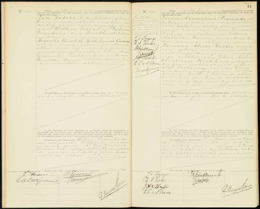 No. 400 n acht Juni negentienhonderd twee en twintig zijn voor mij Ambtenaar van den burgerlijken stand van Amsterdam verschenen, ten einde een huwelijk aan te gaan: Jan Ieders, bedryfsleider, geboren: en wonende alhier, oud twee en dertig jaren, meerderjarige zoon: van Willem Ieders en Jcolina Berendina van Bronkhorst beiden overleden en Margaretha Elisabeth Wilhelmina Gromme, zonder beroep, geboren en wonende alhier, oud vif en dertig jaren meerderjarige dochter van Arie Gromme, nachtwaker, en Anno Henriëtta Stijger, zonder beroep, bei den wonende alhier De afkondiging tot dit huwelijk is onverhinderd geschied, alhier den zeven en twintigsten Mei laatstleden Ik heb bruidegom en bruid afgevraagd of zij elkander nemen tot echtgenooten en getrouwelijk alle de plichten zullen vervullen, welke door de wet aan den huwelijken staat verbonden zijn. Nadat deze vragen door hen bevestigend beantwoord werden, heb ik, in naam der wet, uitspraak gedaan, dat zij door het huwelijk aan elkander zijn verbonden Als getuigen waren tegenwoordig: Willem Ieders, broeder des echtgenoots, stoffeerder, oud zeven en dertig jaren, en Arie Gromme boeder der echtgenoote, kantoorbedien, de, oud een en dertig jaren, beiden wonende alhier. No. 401 „ eén. Renvooi en de door haling van één. geschreven woord in den zesden reg gel van boven in nevensstaande akte, goedgekeurd. 9 Vf Barend JB. A. Hacker. Schunken Jchns JAC Hook E C vd Vorm Guyoers zeeven Heden acht tuni negentienhonderd twee en twintig zijn voor mij Ambtenaar van den burgerlijken stand van Amsterdam verschenen, ten einde een huwelijk aan te gaan: Joannes Laurentius Barends met selaar, geboren en wonende alhier oud twee en dertig jaren, meerder jarige zoon van Lucas Franciseus Barends, metselaar, in Frederica Mathilda Hamers, zonder beroep, bes den wonende alhier, en Harmina Aleida Hacker, zonder be roep, geloren en wonende alhier oud negentien jaren, minderja rige dochter van Johan Adam Christiaan Hacker, oud acht en vier tig jaren, pakhuisknecht, en Elisa beth Catharina van der Vorm oud een en vijftig jaren, zonder beroep, beiden wonende alhier De ouders der bruid verklaarden voor mij tegenwoordig toe te stem„ men in dezen echt. De afkondiging tot dit huwelijk is onverhinderd geschied, alhier den zeven en twintigsten Mei laatstleden Ik heb bruidegom en bruid afgevraagd of zij elkander nemen tot echtgenooten en getrouwelijk alle de plichten zullen vervullen, welke door de wet aan den huwelijken staat verbonden zijn. Nadat deze vragen door hen bevestigend beantwoord werden, heb ik, in naam der wet, uitspraak gedaan, dat zij door het huwelijk aan elkander zijn verbonden Als getuigen waren tegenwoordig: Pier Johannes de Visse van Bloemen, winkelier, oud zes en dertig jaren, en Gerrit Romp huis, teekenaar bij Publieke werken, oud achtentwintig jaren, beiden wonende alhier Jaarvan akte, welke overeenkopstig de wet is voorgelezen. W. Jeders J teders Rolier MMEW Gromme C Waarvan akte, welke oiereenkomstig de wet is voorgdezen. J/t Barense Jaukun Kampligs H. A. Hader. PMuyeen Boene Jd LJoeke E C vd Vorm