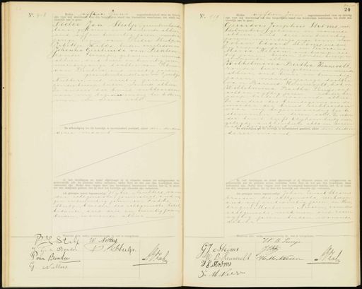 No. 418 Heden vijftien Juni negentienhonderd twee en twintig zijn voor mij Ambtenaar van den burgerlijken stand van Amsterdam verschenen, ten einde een huwelijk aan te gaan: Pieter Jan Stulp, groentenhanden laar, geboren en wonende alhier oud vijf en twintig jaren, meerder„ jarige zoon van Pieter Stulp, en Zebeltje Valda, beiden overleden, en Johanna Geertruida van Benten. zonder beroep, geboren en wonende alhier, oud twee en twintig jaren meerderjarige dochter van Petrus van Benten, oud veertig jaren groentenhandelaar in Geertje Nutters, oud veertig jaren zonder beroep, beiden wonende alhier, De ouders der bruid verklaarden voor mij tegenwoordig toe te stem men in dezen echt De afkondiging tot dit huwelijk is onverhinderd geschied, alhier den derden dezer maand Ik heb bruidegom en bruid afgevraagd of zij elkander nemen tot echtgenooten en getrouwelijk alle de plichten zullen vervullen, welke door de wet aan den huwelijken staat verbonden zijn. Nadat deze vragen door hen bevestigend beantwoord werden, heb ik, in naam der wet, uitspraak gedaan, dat zij door het huwelijk aan elkander zijn verbonden. Als getuigen waren tegenwoordig: Wijfze Mutters oom der echtgenoote jaurnalist, oud ne gen entwintig jaren, en Pokke stulk, broeder zes echtgenoots, totel„ bediende, oud drie en twintig jaren, beiden, wonende alhier No 419 leden vijftien Juni negentienhonderd twee en twintig zijn voor mij Ambtenaar van den burgerlijken stand van Amsterdam verschenen, ten einde een huwelijk aan te gaan: Gerardus Josephus Stroms, mo delmaker, geboren en wonende alhier, oud drie en twintig jaren, meerderjarige zoon van Johan Edvard Stroms, oud drie den zeventig jaren, en Francina Maria Neesen, oud twee en zes tig jarens beiden zonder beroep en onende alhier en Wilhelmina Bertha Hennevelt zonder beroep, geboren en wonende alhier, oud twee en twintig jaren, meerderjarige dochter van Barend Hennevelt, kok, en 0 Wichelmina Bartha Pruys, oud acht en vijftig jaren, zonder be roep, beiden wonende alhier De ouders des bruidegoms en de moeder der bruid verklaarden voor mij tegenwoordig toe te stemmen in dezen echt. De vader der bruid heeft blykens hierbij over gelegde authentieke akte in dezen echt toegestemd De afkondiging het dit huwelyjk is onverhinderd geschied, alhier den derden dezer maand Ik heb bruidegom en bruid afgevraagd of zij elkander nemen tot echtgenooten en getrouwelijk alle de plichten zullen vervullen, welke door de wet aan den huwelijken staat verbonden zijn. Nadat deze vragen door hen bevestigend beantwoord werden, heb ik, in naam der wet, uitspraak gedaan, dat zij door het huwelijk aan elkander zijn verbonden. Als getuigen waren tegenwoordig: Johan Eduard Stroms broeder des echtgenoots, werkman oud vijf entwintig jaren, in Hen„ dricus Martinus Neesen, oom des Echtgenoots, werkman, oud zes en vijftig jaren, beiden wonende alhier lWaarvan gete, welke overeenkomsig de wet is voorgeleten. Stulf W: Noetters J G. v. Benten. J Sulp. J van Benter ABZake J: Nutters W. B. Ruys. J Chn GJ. Stroms PW B. Hennevelt H M Meesen AVZake I E. Stroms T. M Veerre