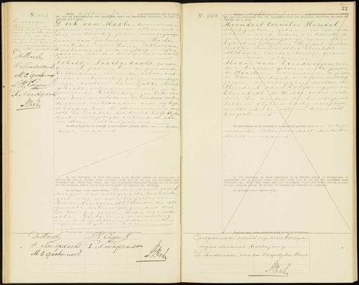 No. 422 moeder Renvooi en de doorhaling van een geschreven woord in den negentienden regel van boven in nevensstaan, de akte goedgekeurd DoHarle. F. Noortgedacht M C Gurformaf B. Caspe A Noditgedach AZahn Heden vijftien Juni negentienhonderd twee en twintig zijn voor mij Ambtenaar van den burgerlijken stand van Amsterdam verschenen, ten einde een huwelijk aan te gaan Dirk van Marle, timmerman ngeboren en wonende alhier, oud- drie en twintig jaren, meerderjarige zoon van Gerhardus van Marle, overleden en aria Catharina Amakernaat, oud vijftig en vyftig jaren, zonder beroep, wonende al hier, en Jokeltje Noortgedacht, zonder it beroep, geboren in de gemeente Rotterdam, wonende alhier, oud- vier en twintig jaren, meerderja„ rige dochter van Tjebbe Noort gedacht, schipper, wonende in de Gemeente Rotterdam en Oeke van der zie, overleden. De ouders des brui„ de goms verklaarden voor my tegen„ woordig toe te stemmen in dezen echt. De vader der bruid heeft blijkens hierbij overgelegde authentieke akte in dezen echt toegestemd De afkondiging tot dit huwelijk is onverhinderd geschied, alhier den derden dezer maand Ik heb bruidegom en bruid afgevraagd of zij elkander nemen tot echtgenooten en getrouwelijk alle de plichten zullen vervullen, welke door de wet aan den huwelijken staat verbonden zijn. Nadat deze vragen door hen bevestigend beantwoord werden, heb ik, in naam der wet, uitspraak gedaan, dat zij door het huwelijk aan elkander zijn verbonden Als getuigen waren tegenwoordig: Pieter van Caspet zwager des echtgenoots, bankwerker oud vier en twintig jaren, en Renze Noortgedacht, broeder der echt genoote, ziekenverpliger, oud drie en twintig jaren, beiden wonende alhier, Goedgekeurd de doorhaling van drie geschreven letters in den negenden regel van bover No. 4B