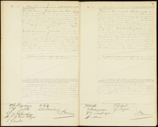 No. 392 Heden zeven Juni negentienhonderd twee en twintig zijn voor mij Ambtenaar van den burgerlijken stand van Amsterdam verschenen, ten einde een huwelijk aan te gaan: Wilhelmus Josephus van Litsenburg hellver, geboren in de gemeente 's Her togenbosch, wonende alhier, ong vier en twintig jaren, meerder jarige zoon van Arnoldus Te tuis van Litsenburg, oud twee en zestig jaren, ijzergieter en Ma ria Thilomena Jooepha van Rijn oud zeven en vyftig jaren, zonder beroep, beiden wonende alhier, en Wilhelmina Jacobs, zonder te roep, geboren en wonende alhier oud vier en twintig jaren, meer derjarige dochter van Lion Jacobs oud acht en vyftig jaren, didmant slijper, wonende alhier, en Mietje Vssendrijver, overleden. De ouders des bruidegoms en de vader der bruid verklaarden voor mij tegenwoor dig toe te stemmen in dezen echt De afkondiging tot dit huwelijk is onverhinderd geschied, alhier den zeven en twintigsten Mei laatstleden. Ik heb bruidegom en bruid afgevraagd of zij elkander nemen tot echtgenooten en getrouwelijk alle de plichten zullen vervullen, welke door de wet aan den huwelijken staat verbonden zijn. Nadat deze vragen door hen bevestigend beantwoord werden, heb ik, in naam der wet, uitspraak gedaan, dat zij door het huwelijk aan elkander zijn verbonden Als getuigen waren tegenwoordig Isaar Pulp, zwager der echtgenoote, kleermaker, oud een en dertig jaren, en Martinus Adrianus Marie van Litsenburg, van beroep veemarbei der, broeder des echtgenoots, oud vijf en twintig jaren, beiden wonende alhier No. 393 Heden zeven Juni neg twee en twintig zijn voor mij Ambtenaar van den burgerlijken stand van Amsterdam verschenen, ten einde een huwelijk aan te gaan: Johan Leonard Lodewijks, elee tricien, geboren en wonende alhier oud een en twintig jaren, meer derjarige zoon van Coert Hendrik Lodewijks, overleden, en Wilhelmo na Geertruida Vversteegen, oud vier en veertig jaren, zonder beroep, wonen de alhier, en Trijntje Westerheijden, zonder beroep, geboren en wonende alhier oud twintig jaren, minderjari ge dochter van Johan Frederik Wilhelm Westerheyden, overleden en Trijntje Bus, oud drie en vyftig jaring zonder beroep, wonende al hier. De beide moeders verklaar den voor mij tegenwoordig toe te stemmen in dezen echt De afkondiging tot dit huwelijk is onverhinderd geschied, alhier den zeven en twintigsten Mei laatstleden Ik heb bruidegom en bruid afgevraagd of zij elkander nemen tot echtgenooten en getrouwelijk alle de plichten zullen vervullen, welke door de wet aan den huwelijken staat verbonden zijn. Nadat deze vragen door hen bevestigend beantwoord werden, heb ik, in naam der wet, uitspraak gedaan, dat zij door het huwelijk aan elkander zijn verbonden Als getuigen waren tegenwoordig: Jacob Richard ma chimst, oud zeven en twintig ja ren, en Gerrit Meyer werkman oud vijftig jaren, beiden wonen de alhier is voorgelez WJ v. Likenburg. J. Tulp. W. Jacobs. MAMchetverbarg P v Litsenbrog Brevee M F J Van Bijn L /acobs et is voorgelezen. J Kichard Jhhodewijks G. Meijer T. Westelrijden W G Oversteeijen Brives V: Bus