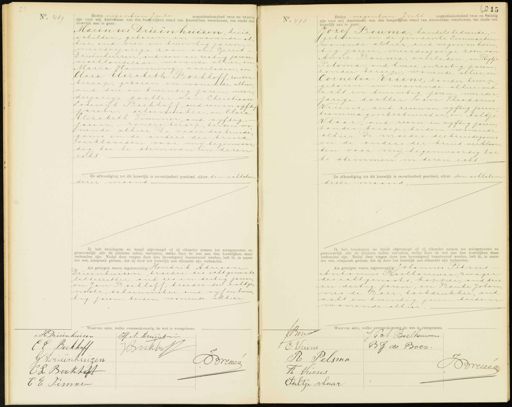No. 489 Heden negentien Juli negentienhonderd twee en twintig zijn voor mij Ambtenaar van den burgerlijken stand van Amsterdam verschenen, ten einde een huwelijk aan te gaan: Marinus Drieënhuizen, huis„ schilder geboren en wonende al hier, oud vier en twintig jaren, meerderjarige zoon van Gerrit Drieenhuizen, oud een en zestig jaren, vischtandelaar, wonende alhier, en Maria Samming overleden, en Clara Elizabeth Boekhoff, zonder beroep, geboren en wonende alhier oud drie en twintig jaren, meer derjarige dochter van Christiaan Lodewijk Boekhoff, oud een en vijftig jaren, schoenmaker, en Clara Elizabeth Timmer, oud vijftig jaren, zonder beroep, beiden wo nende alhier. De vader des bruide goms en de ouders der bruid verklaarden voor mij tegenwoor dig toe te stemmen in dezen echt De afkondiging tot dit huwelijk is onverhinderd geschied, alhier den achtsten dezer maand. Ik heb bruidegom en bruid afgevraagd of zij elkander nemen tot echtgenooten en getrouwelijk alle de plichten zullen vervullen, welke door de wet aan den huwelijken staat verbonden zijn. Nadat deze vragen door hen bevestigend beantwoord werden, heb ik, in naam der wet, uitspraak gedaan, dat zij door het huwelijk aan elkander zijn verbonden. Als getuigen waren tegenwoordig: Hendrik Adriaan Drieenhuizen, broeder des echtgenoots, lettezzetter, oud zes en dertig jaren, en Jan Boekhoff, broeder der echtge„ noote, schoenmaker, oud vijf en twin„ tig jaren, beiden wonende alhier. No. 490 ƒ 15 negentien Juli negentienhonderd twee en twintig zijn voor mij Ambtenaar van den burgerlijken stand van Amsterdam verschenen, ten einde een huwelijk aan te gaan Jozet Bouma, handels bediende geboren in de gemeente Leeuwarden wonende alhier, oud negen en twin tig jaren, meerderjarige zoon van Anne Bouma, overleden, en Rigtje Pelsma, oud twee enzestig jaren, zonder beroep, wonende alhier, en Cornelia Vriens, zonder beroep geboren en wonende alhier, oud acht en twintig jaren meerder jarige dochter van Theodorus Vriens, oud zeven en vijftig jaren tramwagenbestuurder, en Aaltje Hlaar oud zeven en vijftig jaren, zonder beroep, beiden wonende alhier. De moeder des bruidegoms en de ouders der bruid verklaar, den voor mij tegenwoordig toe te stemmen in dezen echt De afkondiging tot dit huwelijk is onverhinderd geschied, alhier den achtsten dezer maand Ik heb bruidegom en bruid afgevraagd of zij elkander nemen tot echtgenooten en getrouwelijk alle de plichten zullen vervullen, welke door de wet aan den huwelijken staat verbonden zijn. Nadat deze vragen door hen bevestigend beantwoord werden, heb ik, in naam der wet, uitspraak gedaan, dat zij door het huwelijk aan elkander zijn verbonden. Als getuigen waren tegenwoordig: Johannes Petrus Antanius Poelhouwer zwager des echtgenoots, kapper, oud drie en dertig jaren, en Bouke Johan, nes de Boer, boekdrukker, oud acht en twintig jaren, beiden wonende alhier. Waarvan akte, welke overeenkomstig de wet is voorgelezen. ACDrieënhuizen H. A. Drienhe Boekhef C. E. Boekheff G Drieenhuizen Brevee CL Boekhe C E Timner Waarvan akte, welke overeenkomstig de wet is, voorgelezen. JBouw A Boelhouwen BJ de Boer. C Vriens H Pelsma Breveee F Vuers Paltje Maar