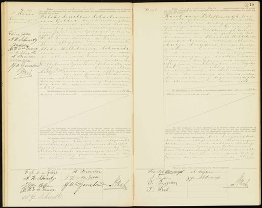 Maria gekeurd. Renvooigoed F AS van Gelder A.W. Schwartz Jvrold v M H L denVouwe n G Schwarti A Brouwer J W van Gelde Ja Gerritsen ArKah Heden negentien Juli negentienhonderd twee en twintig zijn voor mij Ambtenaar van den burgerlijken stand van Amsterdam verschenen, ten einde een huwelijk aan te gaan Feliks Arnoldus Sebastianus van Gelder, bankwerker, geboren en wonende alhier, oud drie en twintig jaren, meerderjarige zoon van Jan van Gelder, oud drie en vijftig jaren, expeditieknecht, en Hubertina Lonisa de Fauwe, omd vijf en vijftig jaren, zonder beroep, bei den wonende alhier, en zonder beroep, gelaren en wonen Alida Wilhelmina Schwartz de alhier, oud twee en twintig jaren, meerderjarige dochter van eWilhelmus Gerardus Schwartz, oud vijftig jaren, brandwacht, en Aaltje Brouwer, oud vyftig jaren —zonder beroep, beiden wo nende alhier. Beider ouders ver klaarden voor mij tegenwoor dig toe te stemmen in dezen echt De afkondiging tot dit huwelijk is onverhinderd geschied, alhier den achtsten dezer maand Ik heb bruidegom en bruid afgevraagd of zij elkander nemen tot echtgenooten en getrouwelijk alle de plichten zullen vervullen, welke door de wet aan den huwelijken staat verbonden zijn. Nadat deze vragen door hen bevestigend beantwoord werden, heb ik, in naam der wet, uitspraak gedaan, dat zij door het huwelijk aan elkander zijn verbonden Als getuigen waren tegenwoordig: Johannes Wilhelmus van Gelder, broeder des echtgenoots melkbezorger, en Johannes Arnoldus Gerritsen, arbeider remmerbij al Nederlandsche spoorwegen, beiden ze venentwintig jaren vud en wonen de alhier No. 498 4919 Heden negentien Juli negentienhonderd twee en twintig zijn voor mij Ambtenaar van den burgerlijken stand van Amsterdam verschenen, ten einde een huwelijk aan te gaan Karel van Blitterswijk, loop knecht, geboren en wonende alhier oud twee en dertig jaren, meer derjarige zoon van Gerardus Jo hannes van Blitterswijk, lootsver ter, wonende in de gemeente rot terdam, en Elisabeth Stikkelorum, zonder beroep, wonende alhier, en Antje Snijders, zonder beroep geboren en wonende alhier oud zeven en twintig jaren meerderjarige dochter van Tijmen snijders oud zeven en zestig jaren, melkslyter en Tryjntje Kol, oud zes en zestig jaren zonder beroep, beiden wonende al hier. De ouders der bruid verklaar den voor mij tegenwoordig toe te stemmen in dezen echt De afkondiging tot dit huwelijk is onverhinderd geschied, alhier den achtsten dezer maand Ik heb bruidegom en bruid afgevraagd of zij elkander nemen tot echtgenooten en getrouwelijk alle de plichten zullen vervullen, welke door de wet aan den huwelijken staan verbonden zijn. Nadat deze vragen door hen bevestigend beantwoord werden, heb ik, in naam der wet, uitspraak gedaan, dat zij door het huwelijk aan elkander zijn verbonden. Als getuigen waren tegenwoordig: Arie Snijders, broe der der echtgenoote, tramwagen eestinder, oud acht en dertig jaren, en Gerardus Johanne van Blitterswijk, broeder des echt genoots, houtdraaur oud dertig jaren, beiden wonende alhier Waarvan akte, welke overeenkomstig de wet is voorgelezen. aarvan akte, welke overeenkomstig de wet is voorgelezen. F A S vn Gelder A Brouder J H van Geldu A. W. Schwartj. J.A. Gereitsen J: Rakn JJ van Gelen M H P de Fauwr W G Schwatth K vOlterwijf A. twijder GJ. Pletterpwijk A Inaders J: Enelrg AKake T. Rol.