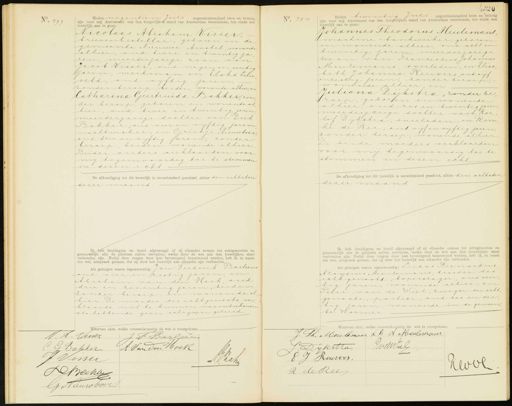 No. 499 Heden negentien uuli negentienhonderd twee en twintig zijn voor mij Ambtendar van den burgerlijken stand van Amsterdam verschenen, ten einde een huwelijk aan te gaan Nicolaas Abraham Visser, trievenbesteller, geboren in de gemeente Nieuwer Amstel, wonende alhier, oud twee en twintig ja ren, meerderjarige zoon van Jacob Visser, oud negen en veertig jaren, werkman en Elske Lelie veld, oud vijftig jaren zonder beroep, beiden wonende alhier, en Catharina Geertruida Bakker, zon der beroep, geboren en wonende al¬ hier, oud twee en twintig jaren meerderjarige dochter van Dirk Bakker, oud vier en vyftig jaren nochtwakers en Grietje Nieuwboer oud drie en vijftig jaren zonder beroep, beiden wonende alhier Beider ouders verklaarden voor mij tegenwoordig toe te stemmen in dezen echt De afkondiging tot dit huwelijk is onverhinderd geschied, alhier den achtsten dezer maand Ik heb bruidegom en bruid afgevraagd of zij elkander nemen tot echtgenooten en getrouwelijk alle de plichten zullen vervullen, welke door de wet aan den huwelijken staat verbonden zijn. Nadat deze vragen door hen bevestigend beantwoord werden, heb ik, in naam der wet, uitspraak gedaan, dat zij door het huwelijk aan elkander zijn verbonden. Als getuigen waren tegenwoordig: Jan Fredirik Barlecus oud vier en zestig jaren, in Abrcham van den Hoek oud drie en zeventig jaren, beiden zonder beroep, en wonende al„ hier. De moeder des echtgenoots ver„ klaarde niet te kunnen naamteekenen als hebbende geen schrijven geleerd. No. 500 1 negentienhonderd twee en twintig Heden twintig zijn voor mij Ambtenaar van den burgerlijken stand van Amsterdam verschenen, ten einde een huwelijk aan te gaan: Johannes Theodorus Meulemans, machirebankwerker, geboren en wonende alhier, oud acht en twintig jaren, meerderjarige zoon van Franciscus Johannes Meulemans, overleden, in Elisa beth Johanna Reuvers, oud vyf enzestig jaren, zonder beroep wonende alhier, en Juliana Dykstra, zonder be„ roep, geboren en wonende alhier, oud zes en twintig jaren meerderjarige dochter van Roe lof Dijkstra, overleden, en Rim ke de Ree, oud vijf en vijftig jaren zonder beroep, wonende alhier De beide moeders verklaarden voor mij tegenwoordig toe te stemmen in dezen echt De afkondiging tot dit huwelijk is onverhinderd geschied, alhier den achtsten dezer maand Ik heb bruidegom en bruid afgevraagd of zij elkander nemen tot echtgenooten en getrouwelijk alle de plichten zullen vervullen, welke door de wet aan den buwelijken staat verbonden zijn. Nadat deze vragen door hen bevestigend beantwoord werden, heb ik, in naam der wet, uitspraak gedaan, dat zij door het huwelijk aan elkander zijn verbonden. Als getuigen waren tegenwoordig: Licas Bernardus Aloysius Meulemans, broeder des echtgenoots, koperslager, oud veer, tig jaren, wonende alhier, en Peter van de Wiel, zwager der echt„ genoote, porteer, oud zes en der tig jarin, wonende in de gemeen„ te Wormer AH. Iunr JF: Barleeen CG Dakker A Van den Hoek J Vister AZake PBechbe G Heuwboer Waarvan akte, welke overeenkomstig Oorgelezen. J. Th. Meulemans. & p. A Meulemans Jvanel Dijkstra E J Reuvers. Kevol R de Reef
