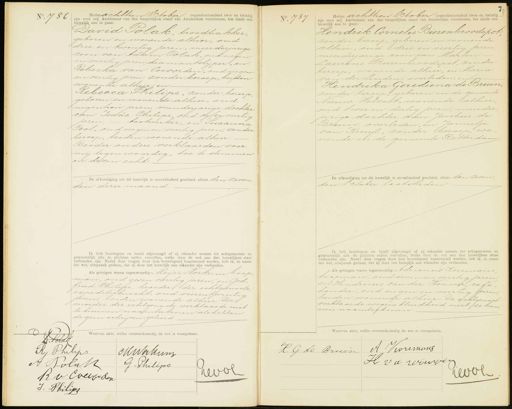 No. 786 Heden achttien October negentienhonderd twee en twintig .zijn voor mij Ambtenaar van den burgerlijken stand van Amsterdam verschenen, ten einde een huwelijk aan te gaan: David Polak, broodbakker geboren en wonende alhier, oud drie en twintig jaren, meerderjarige zoon van Adam Polak, oud negen en veertig jaren, diamantslijper, en Rebecka van Coevorden, oud negen en veertig jaren, zonder beroep, beiden wonende alhier en Rebecca Philips, zonder beroep. geboren en wonende alhier, oud negentien jaren, minderjarige dochter van Iiaac Philips, oud vifenveertig jaren, — bootwerker en susanna Pool, oud negen en veertig jaren, zonder beroep, beiden wonende alhier. Beider ouders verklaarden, voor mij tegenwoordig, toe te stemmen in dezen echt. De afkondiging tot dit huwelijk is onverhinderd geschied, alhier den Zeven den dezer maand Ik heb bruidegom en bruid afgevraagd of zij elkander nemen tot echtgenooten en getrouwelijk alle de plichten zullen vervullen, welke door de wet aan den huwelijken staat verbonden zijn. Nadat deze vragen door hen bevestigend beantwoord werden, heb ik, in naam der wet, uitspraak gedaan, dat zij door het huwelijk aan elkander zijn verbonden. Als getuigen waren tegenwoordig: Meijer Workumkoopman, oud zesen veertig jaren, en Godfried Thilips, broeder der echtgenoote expeditieknecht, oud vierentwintig jaren, beiden wonende alhier Deg moeder der echtgenoote verklaarde niet te kunnen naamteekenen als hebben. de geen schriven geleerd No. 787. achttien October neg zijn voor mij Ambtenaar van den burgerlijken stand van Amsterdam verschenen, ten einde een huwelijk aan te gaan: Hendrik Cornelis Bierenbroodspot zonder beroep, geboren en wonende alhier, oud drie en veertig jaren. meerderjarige zoon van Marten Laurens Bierenbroodspot, zonder beroep, wonende alhier, en Maria van der Linden, overleden, en Hendrika Gerediena de Bruin zonder beroep, geboren in de gemeente Nieuw-Helvoet, wonende alhier. oud twee en dertig jaren, meerder jarige dochter van Jacobus de Bruin, overleden, en Jannetje van Kruijl, zonder beroep, wo nende in de gemeente Rotterdam De afkondiging tot dit huwelijk is onverhinderd geschied, alhier den Zevenden October laatstleden Ik heb bruidegom en bruid afgevraagd of zij elkander nemen tot echtgenooten en getrouwelijk alle de plichten zullen vervullen, welke door de wet aan den huwelijken staaverbonden zijn. Nadat deze vragen door hen bevestigend beantwoord werden, heb ik, in naam der wet, uitspraak gedaan, dat zij door het huwelijk aan elkander zijn verbonden. Als getuigen waren tegenwoordig: Adrianus Roremans koopman, oud zeven en veertig jaren en Hendricus van der Houwer, café houder, oud negen en veertig jaren beiden wonende alhier. De echtgenoot verklaarde wegens blindheid niet te kun nen naamteekenen. Waarvan akte, welke overeenkomstig de wet is voorgelezen. D: Volak R Philips Mutekump G. Philips A Polyk Kevol R v Colvorden J: Philips H.G. de Bruin A Koremans H vd wouwen Mool