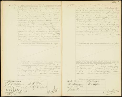 No. 889 Heden tweeëntwintig November negentienhonderd twee en twintig zijn voor mij Ambtenaar van den burgerlijken stand van Amsterdam verschenen, ten einde een huwelijk aan te gaan: Johan Balthazar Grootendorst, pakhursknecht, geboren en wonende al- hier, oud zevenentwintig jaren, meer- derjarige zoon van Abraham Groo- tendorst, oud achtenzestig jaren kleermaker en Maria Visser, oud achtenzestig jaren zonder beroep, beiden wonende alhier en Josina Hendrika Maria- Hillebrand, zonder beroep, geboren en wonende alhier, oud zesentwintig jaren, meerderjarige dochter van Christiaan Josephus Marie Hillebrand, oud vijftig jaren — brigadier van politie, wonende alhier en Maria Magtalena van Varick Ludolph, overleden. De ouders des brui- degomsen de vader der bruid verklaarden, voor mij tegenwoordig, toe te stemmen in dezen echt De afkondiging tot dit huwelijk is onverhinderd geschied, alhier den elfden dezer maand Ik heb bruidegom en bruid afgevraagd of zij elkander nemen tot echtgenooten en getrouwelijk alle de plichten zullen vervullen, welke door de wet aan den huwelijken staat verbonden zijn. Nadat deze vragen door hen bevestigend beantwoord werden, heb ik, in naam der wet, uitspraak gedaan, dat zij door het huwelijk aan elkander zijn verbonden. Als getuigen waren tegenwoordig: Cornelis Bartholo- mens Vijfjes, zwager des bruidegoms, schoenmaker, oud vijfenveertig jaren, en Ludovicus Reodorus Johannes ten Rroode, kantoorbediende, oud eenenveertig jaren, beiden wonende alhier No. 888 IM Heden twee ëntwintig November negentienhonderd twee en twintig zijn voor mij Ambtenaar van den burgerlijken stand van Amsterdam verschenen, ten einde een huwelijk aan te gaan: Hendrik Kornelis Kolder, ban ketbakker, geboren in de gemeente Kam pen, wonende alhier, oud vijfentwinti jaren, meerderjarige zoon van Berend Jan Kolder, overleden en Zwaantje Westerholf, oud zesenvijftig jaren zonder beroep, wonende alhier en Hendrika Maassen zonder be roep, geboren in de gemeente Haarlem, wonende alhier, oud twee entwintig ja ren, meerderjarige dochter van sars Maassen, overleden en Jannetje Mol leman, oud tweeënvijftig Jaren zonder beroep wonende alhier. De beide moeders verklaarden, voor mij tegen woordig, toe te stemmen in dezen icht De afkondiging tot dit huwelijk is onverhinderd geschied, alhier den elfden dezer maand Ik heb bruidegom en bruid afgevraagd of zij elkander nemen tot echtgenooten en getrouwelijk alle de plichten zullen vervullen, welke door de wet aan den huwelijken staan verbonden zijn. Nadat deze vragen door hen bevestigend beantwoord werden, heb ik, in naar der wet, uitspraak gedaan, dat zij door het huwelijk aan elkander zijn verbonden. Als getuigen waren tegenwoordig: Carel Diederich Meijer, werkman, oud zesenveer tig jaren, en Hendrik van Wijk, zwager des echtgenoots, schuite voerder, oud zesentwintig jaren, beiden wonende alhier Waarvan akte, welke overeenkomstig de wet is voorgelezen. J B Grottendorst. J.H. M. Hillebrard C B Vyfjes A Grootensorst K.Th.J. ten Krool m E E Noe HHJMebrerd Waarvan akte, welke overeenkomstig de wet is voorgelezen. H.K. Kolder. CD Meyer H v Dijk H Maassen 2 Westerholt J Molleman D Augen one