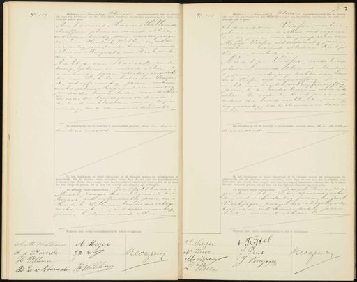 No. 109 Heden eenentwintig Februari negentienhonderd drie en twintig zijn voor mij Ambtenaar van den burgerlijken stand van Amsterdam verschenen, ten einde een huwelijk aan te gaan: Antonius Marius Willemse, chauffeur, geboren en wonende alhier, oud negenentwintig jaren, meerderjarige zoon van Hendrik Willemse, oud een- enzeventig jaren zonder beroep, wonende alhier en Margrieta van Baak, overle- den en Aaltje van Staverde zonder beroep, geboren en wonende alhier, oud eenentwintig jaren, meerderjarige doch ter van Dirk Lambertus van Staver- de, oud vyfenveertig jaren, werkman en Annechina Meijer oud vierenveertig jaren, zonder beroep, beiden wonende alhier De vader des bruidegoms en de ouders der bruid verklaarden, voor mij tegen woordig, toe te stemmen in dezen echt- De afkondiging tot dit huwelijk is onverhinderd geschied, alhier den tien- den dezer maand Ik heb bruidegom en bruid afgevraagd of zij elkander nemen tot echtgenooten en getrouwelijk alle de plichten zullen vervullen, welke door de wet aan den huwelijken staat verbonden zijn. Nadat deze vragen door hen bevestigend beantwoord werden, heb ik, in naam der wet, uitspraak gedaan, dat zij door het huwelijk aan elkander zijn verbonden. Als getuigen waren tegenwoordig: Jan Balthasar Musch, zwager des echtgenoots, dans- leeraar oud vijfenveertig jaren, en- Hendrik Willemse broeder des echtge„ noots werkman, oud vierenveertig jaren, beiden wonende alhier. Waarvan akte, welke overeenkomstig de wet is voorgelezen. No. 110 Heden eenentwintig Februari negentienhonderd drie en twintig zijn voor mij Ambtenaar van den bargerlijken stand van Amsterdam verschenen, ten einde een huwelijk aan te gaan: Samson Visser werkman geboren en wonende alhier, oud negenen twintig jaren, meerderjarige zoon van Meyer Visser, oud drieënzestig jaren werkman, wonende alhier en Keetje Viegra, overleden en Naatje Visser, zonder beroep geboren en wonende alhier, oud achtentwin tig jaren, meerderjarige dochter van Leen dert Visser, oud vierenvijftig Jaren, en Adriana Trytel oud vijfenvijftig Jaren, beiden zonder beroep en wonende alhier. De vader des bruidegoms en de ouders der bruid verklaarden, voor mij tegenwoordig, toe te stemmen in dezen echt De afkondiging tot dit huwelijk is onverhinderd geschied, alhier den derden dezer maand Ik heb bruidegom en bruid afgevraagd of zij elkander nemen tot echtgenooten en getrouwelijk alle de plichten zullen vervullen, welke door de wet aan den huwelijken staat verbonden zijn. Nadat deze vragen door hen bevestigend beantwoord werden, heb ik, in naam der wet, uitspraak gedaan, dat zij door het huwelijk aan elkander zijn verbonden. Als getuigen waren tegenwoordig: Joseph Pens, zwa ger der echtgenoote spoorwegarbei der, oud vierendertig jaren, en Jacob Vischjager, zwager der echtgenoote koopman, oud zevenendertig jaren beiden wonende alhier Waarvan akte, welke overeenkomstig de wet is vo A. M. Willemse A Meijer J.B. Wer A v Hoverde. tZlOO peron H Willimie D Ee v. Bhaverde H Wallem J Kijfel S: Visser. J Pens N. Visser. DZwoterdn Ja M Viszen Vischager Ba L. Vitser