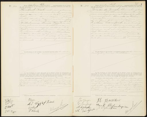 No. 102 Heden veertien Februari negentienhonderd drie en twintig zijn voor mij Ambtenaar van den burgerlijken sland van Amsterdam verschenen, ten einde een huwelijk aan te gaan: Hendrik Kat, werkman, geboren en wonende alhier, oud vier en twintig jaren, meer derjarige zoon van Coenraad Kat, oud twee en vijftig jaren, - diamantslijper- en Johanna Cornelia Christina Kuijpers, oud vier en vyftig jaren, — zonder beroep, beiden wonende alhier, en Wilhelmina Maria Wijgh, zonder beroep, geboren en wonende alhier, oud drie en twintig jaren, meerderjarige dochter van Pieter Wijgh, oud zesenvyftig jaren, - hoofdcontro, leur bij een melkinrichting, en Maria Louwsa Tietzel, oud achtenvyftig jaren, - zonder beroep, beiden wonende alhier. Beider ouders verklaarden, voor mij tegenwoordig toe te stemmen in dezen echt De afkondiging tot dit huwelijk is onverhinderd geschied, alhier den derden dezer maand Ik heb bruidegom en bruid afgevraagd of zij elkander nemen tot echtgenooten en getrouwelijk alle de plichten zullen vervullen, welke door de wet aan den huwelijken staat verbonden zijn. Nadat deze vragen door hen bevestigend beantwoord werden, heb ik, in naam der wet, uitspraak gedaan, dat zij door het huwelijk aan elkander zijn verbonden. Als getuigen waren tegenwoordig: Gerardus Cornelis Kat broeder des echtgenoots, cafehouder, oud een en dertig jaren, en Pieter Wijgh, broeder der echt genoote werkman, oud negenentwintig jaren beiden wonende alhier. No. 103 Heden veertien Februari negentienhonderd drie en twintig zijn voor mij Ambtenaar van den burgerlijken stand van Amsterdam verschenen, ten einde een huwelijk aan te gaan: Jonas de Jongh, kleermaker, geboren en wonende alhier, oud zeven en twintig jaren, meerderjarige zoon van Mozes de Jongh, ons zesenzestig jaren, kleermaker, en Rebicca„ Ossendrijver, oud zeven en zestig jaren, zonder beroep, beiden wonende alhier, en Esther Zamford, zonder beroep, ge boren en wonende ahier, oud vier entwin tig jaren, meerderjarige dochter van Hensch Zamford, oud zeventig jaren.— en Haije Harsekow, oud zesenzestig jaren, beiden zonder beroep en wonende alhier Rei„ der ouders verklaarden, voor mij tegenwoordig= toe te stemmen in dezen echt. De afkondiging tot dit huwelijk is onverhinderd geschied, alhier den zeven en twintigsten Januari laatstleden Ik heb bruidegom en bruid afgevraagd of zij elkander nemen tot echtgenooten en getrouwelijk alle de plichten zullen vervullen, welke door de wet aan den huwelijken staat verbonden zijn. Nadat deze vragen door hen bevestigend beantwoord werden, heb ik, in naam der wet, uitspraak gedaan, dat zij door het huwelijk aan elkander zijn verbonden. Als getuigen waren tegenwoordig: Saul Ossendrijver, oom des echtgenoots, zonder beroep, oud twee en zeventig jaren, en Jonas Ossendrijver neef des echtgenoots, diamanklijper oud achtenveertig jaren, beiden wonen de alhier De moeder des echtgenoots ver klaarde niet te kunnen naam eckenen, als hebbende geen schriven geleerd Waarvan akte, welke overeenkomstig de wet is voorgelezen. Wy M Kasgh M.S Wyjkjt Poteel