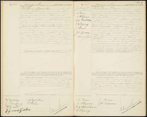 No. 306. Heden negn Mei negentienhonderd drie en twintig zijn voor mij Ambtenaar van den burgerlijken stand van Amsterdam verschenen, ten einde eer huwelijk aan te gaan. Willem Gerritze, Smid-bank werker, geboren en wonende alhier. oud zeven en twintig jaren, meer derjarige zoon van Hendrik Gerritze, oud negen en vijftig jaren werk man en Johanna Geerbarta van Galen, oud zesenzestig jaren, zon„ der beroep, beiden wonende alhier, en Jannetje Bonckamp, zon der beroep, geboren en wonende alhier, oud dertig jaren, meerderjarige dochter van Isaac Johannes Bone kamp, letterzetter, wonende alhier en Elisabeth van Slot, overleden, De ouders des bruidegoms verklaar den, voor mij tegenwoordig, toe te stemmen in dezen echt De afkondiging tot dit huwelijk is onverhinderd geschied, alhier den acht entwintigsten April laatstleden Ik heb bruidegom en bruid afgevraagd of zij elkander nemen tot echtgenooten en getrouwelijk alle de plichten zullen vervullen, welke door de wet aan den huwelijken staat verbonden zijn. Nadat deze vragen door hen bevestigend beantwoord werden, heb ik, in naam der wet, uitspraak gedaan, dat zij door het huwelijk aan elkander zijn verbonden. Als getuigen waren tegenwoordig: Hendrik Gerritze broeder des echtgenoots, tramconducteur oud zeven en dertig jaren, en Franc Bonekamp, broeder der echtgenoote tramconducteur, oud drie en dertig jaren, beiden wonende alhier No. 307 „ in verijssel Renvooi goedgekeurd N. Bivers. G Klijning JG Roomeye D Klyzing C. Broert M Crvese CHuysers Reenen U 9 Heden negen Mei negentienhonderd drie en twintig zijn voor mij Ambtenaar van den burgerlijken stand van Amsterdam verschenen, ten einde een huwelijk aan fe gaan: Nicolaas Broers, werkman, gebo ren en wonende alhier, oud zeven entwin tig jaren, weduwnaar van Maria van der Kort, meerderjarige zoon van Hendrik Broers; glazenwasscher, en Johanna Geerhrui da Roomeijer, oud vier en vyftig jaren. zonder beroep, beiden wonende alhier, en Geertruida / Klijzing, zonder be roep, geboren in de gemeente Hengelon wonende alhier, oud twintig jaren minderjarige dochter van Laniël Rlyzing, oud zeven en zestig jaren scheepstimmerman- en Alida Wilhelmina Bouwhuizen, oud vijf en vijftig jaren, zonder beroep, beiden wa nende alhier Te moeder des bruidegomsen de ouders der bruid verklaarden voor mij tegen woordig, toe te stemmenin dezen echt. De vader desbruidegoms heeft, blijkens hierbij over gelegde authentieke akte in dezen echt toegestemd De afkondiging tot dit huwelijk is onverhinderd geschied, alhier den veer tienden April laatstleden Ik heb bruidegom en bruid afgevraagd of zij elkander nemen tot echtgenooten en getrouwelijk alle de plichten zullen vervullen, welke door de wet aan den huwelijken staat verbonden zijn. Nadat deze vragen door hen bevestigend beantwoord werden, heb ik, in naam der wet, uitspraak gedaan, dat zij door het huwelijk aan elkander zijn verbonden. Als getuigen waren tegenwoordig Cornelis Broers broe der desechtgenoots werkman, oud dertig jaren, en Jacobus Willem Croese zwager der echtgenoote, brievenbesteller oud vierentwintig jaren, beiden wo nende alhier, De moeder der echtgenoote verklaarde niet te kunnen, naamteekenen, als hebbende geen schriven geleerd. Waarvan akte, welke overeenkomstig de wet is voorgelezen. W: Gerritze.M Gerrit J. Bonekamp. F Bonkanjn 2 ep 1 H Gerrit rr J G van Galen N. Broers. C. Broers