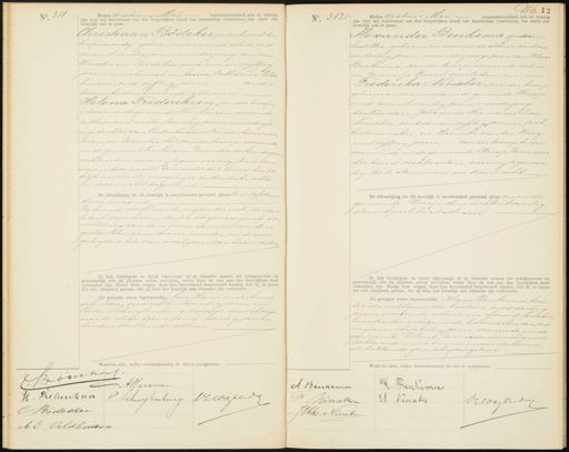 No. 311 Heden zestien Mei negentienhonderd drie en twintig zijn voor mij Ambtenaar van den burgerlijken stand van Amsterdam verschenen, ten einde een huwelijk aan te gaan. Christiaan Bödeker, machinist ter koopvaardij, geboren en wonende alhier, oud vierentwintig jaren, meerderjarige zoon van Christiaan Bödeker, oud vier en vijftig jaren, machinuk en Arna Catharina Veld huizen, oud vyftig jaren,— zonder beroep, beiden wonende, alhier, en Helena Frederiksen, zonder beroep, geboren in de gemeente Ter Neuzen, wonende alhier oud achtentwintig jaren, meerderja rige dochter van Pieter Andries Frederiksen, over leden, en Cornelia Sol, zonder beroep, wonende in de gemeente Ter Neuzen De ouders des bruidegom verklaarden, voor mij tegenwoordig, toe te stem men in dezen echt. De moeder der bruid heeft blijkens hierbij overgelegde authentieke akte, in dezen echt toegestemd De afkondiging tot dit huwelijk is onverhinderd geschied, alhier den vifden dezer maand De bruid verklaarde mij onder eede, de idem titeit van haren vader wegens onjuiste ver„ melding van den voornaam en van den geslachtenaam harer moeder, in de over gelegde akte van overlijden van haren vader Ik heb bruidegom en bruid afgevraagd of zij elkander nemen tot echtgenooten en getrouwelijk alle de plichten zullen vervullen, welke door de wet aan den huwelijken staat verbonden zijn. Nadat deze vragen door hen bevestigend beantwoord werden, heb ik, in naam der wet, uitspraak gedaan, dat zij door het huwelijk aan elkander zijn verbonden. als getuigen waren tegenwoordig: Arie Hammer, huis¬ schilder, oud achtentwintig jaren, en Pieter Schuijlenburg, zwager des echtge nootschauffeur, oud dertig jaren, beiden wonende alhier No. 312 M 12 Heden zestien Mei negentienhonderd drie en twintig zijn voor mij Ambtenaar van den burgerlijken stand van Amsterdam verschenen, ten einde een huwelijk aan te gaan: Alexander Beukema, goederen besteller, geboren en wonende alhier, oud een en dertig jaren, meerderjarige zoon van Haar Beukema, zonder beroep, wonende alhier, en Jannetje Roost, overleden, en Frederika Ninaber, zonder beroep geboren en wonende in de gemeente Weerp- oud zesentwintig jaren, meerderjarige dochter van Johannes Hermanus Louis Ninaber, oud een en vijftig jaren, pak¬ kistenmaker, en Harmke van den Berg. oud vyftig jaren, — zonder beroep, beiden wonende in de gemeente Heesp Deouders der bruid verklaarden, voor mij tegenwoor„ tig, toe te stemmen in dezen echt. De afkondiging tot dit huwelijk is onverhinderd geschied, alhier En in de gemeente, Weesp. den achtentwintig sten April laatstleden Ik heb bruidegom en bruid afgevraagd of zij elkander nemen tot echtgenooten en getrouwelijk alle de plichten zullen vervullen, welke door de wet aan den huwelijken staat verbonden zijn. Nadat deze vragen door hen bevestigend beantwoord werden, heb ik, in naam der wet, uitspraak gedaan, dat zij door het huwelijk aan elkander zijn verbonden. Als getuigen waren tegenwoordig: Klaas Buikema, broe der des echtgenoots koetsier, oud dertig jaren, wonende alhier, en Sjourd Ninaber broeder der echtgenoote, havenarbeider, oud negen en twintig aren, wonende in de gemeente Velsen. De moeder der echtgenoote verklaarde niet te kunnen naamteekenen, als hebbende geen schrijven geleerd Bossche A Hammer H. Fielenhren P Schuijlenburg vawegzerde CBidethee A C Veldhuizen R: Beukema 1 A. Beukema F Minaber S Vinaber Vawogtendag JEKbe: Minaber