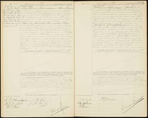 No 302 Echtssteiding uitgesproken bij vonnis der Arrondissiments Rechtbank te Amteedam van 24 September 1934 ingeschreven te Amsterdam heden 17 December 1934. vansout No. 302 Heden negen Mei negentienhonderd drie en twintig zijn voor mij Ambtenaar van den burgerlijken stand van Amsterdam verschenen, ten einde een huwelijk aan te gaan: Mattheus Franciscus Steenhagen, werkman, geboren en wonende alhier. oud drie en twintig jaren, meerderja „tige zoon van Mattheus Hendrik steenhagen, overleden, en Alida eDuiker, oud twee en zestig jaren, zon vder beroep, wonende alhier, en Maria Jacoba Cornelia Bos werkster, geboren en wonende alhier. oud twintig jaren, minderjarige dochter van Hendrik Bosoud acht en veertigjaren, werkman, en Wilhel mina Maria Hartman, zonder be„ roep, beiden wonende alhier De moeder des bruidegems en de vader der bruid verklaarden. voor mij tegenwoordig toe te stemmen in dezen echt De moeder der bruid heeft, blijkens hierbij overge„ legde authentieke akte, in dezen echt toegestemd. De afkondiging tot dit huwelijk is onverhinderd geschied, alhier den acht entwintigsten April laatstleden. Ik heb bruidegom en bruid afgevraagd of zij elkander nemen tot echtgenooten en getrouwelijk alle de plichten zullen vervullen, welke door de wet aan den huwelijken staat verbonden zijn. Nadat deze vragen door hen bevestigend beantwoord werden, heb ik, in naam der wet, uitspraak gedaan, dat zij door het huwelijk aan elkander zijn verbonden. Als getuigen waren tegenwoordig: Antonius Hermanus os, werkman, oud negen en twintig jaren en Johannes Hendricus Hinke machinist oud zesentwintigjaren beiden wonende alhier De moeder des echtgenoots verklaarde niet te kunnen naam teekenen, als hebbende geen schrijven geleerd No. 303 Heden negen Mei negentienhonderd dere en twintig zijn voor mij Ambtenaar van den burgerlijken stand van Amsterdam verschenen, ten einde een huwelijk aan ze gaan Johan Adriaan Spek, leerling machinist bij de Nederlandsche Spoor wegen, geboren in de gemeente Inschedé„ wonende alhier, oud vier en twintig jaren, meerderjarige zoon van Hen drik Spek, timmerman, en Aleida Kip, zonder beroep, beiden wonen de in de gemeente inschede, en Aaltje Graffelman, zonder beroep, geboren in de gemeente Zwolle¬ wonende alhier, oud achtentwin„ tig jaren, meerderjarige dochter van Gerrit Egbert Graffelman. kleermaker, en Roelofje Ester, zonder beroep, beiden wonende in de gemeente Inschedé. Beider ouders hebben blijkens hierbij over„ gelegde authentieke akten, in dezen echt toegestemd De afkondiging tot dit huwelijk is onverhinderd geschied, alhier den acht en twintigsten April laatstleden Ik heb bruidegom en bruid afgevraagd of zij elkander nemen tot echtgenooten en getrouwelijk alle de plichten zullen vervullen, welke door de wet aan den huwelijken staa verbonden zijn. Nadat deze vragen door hen bevestigend beantwoord werden, heb ik, in naam der wet, uitspraak gedaan, dat zij door het huwelijk aan elkander zijn verbonden, Als getuigen waren tegenwoordig: Arie Rouw, leerling machinist, oud vijfentwintig jaren en Claudius Johannes Ruschen klerk bij 's Rijksbelastingen, oud vier en vijftig jaren, beiden wonende alhier Waarvan akte, welke overeenkomstig de wet is voorgelezen. M F Steenhagen A H Voo J H. Hinke M C J: Bos. 7 H6 Bos