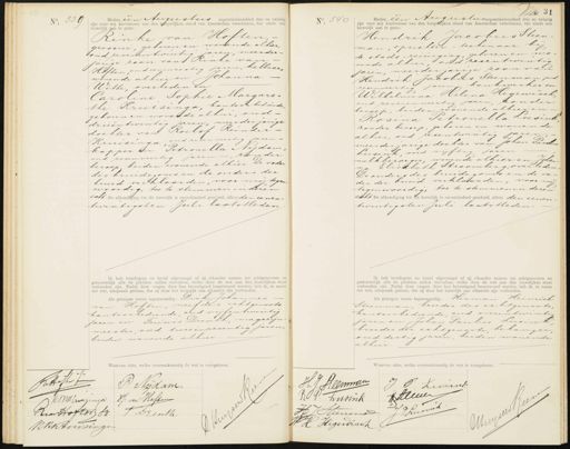 No. 539 Heden een Augustus negentienhonderd drie en twintig zijn voor mij Ambtenaar van den urgerlijken stand van Amsterdam verschenen, ten einde een huwelijk aan te gaan: Rinke van Holten grossier, geboren in wonende alhier, oud zevenentwintig jaren, meerderjarige zoon van Rinke van Hoften, oud eenenzestig jaren, kellnerwonende alhier en Johanna Witte, overleden en Caroline Sophie Margarethe Kruisinga, kantoorbediende geboren en wonende alhier, ouddrieën twintig jaren, meerderjarige dochter van Roelof Reinder Kruisinga oud zesenveertig jaren8 kapper en Petronella Nijdam, oud zesenveertig jaren —, zonder beroep beiden wonende alhier. De vader des bruidegoms en de ouders der bruid verklaarden, voor my tegenwoordig, toe te stemmen in dezen eoht. De afkondiging tot dit huwelijk is onverhinderd geschied, alhier den eenentwintigsten Juli laatstleden, Ik heb bruidegom en bruid afgevraagd of zij elkander nemen tot echtgenooten en getrouwelijk alle de plichten zullen vervullen, welke door de wet aan den huwelijken staat verbonden zijn. Nadat deze vragen door hen bevestigend beantwoord werden, heb ik, in naam der wet, uitspraak gedaan, dat zij door het huwelijk aan elkander zijn verbonden. Als getuigen waren tegenwoordig: Dirk Johannes van Hoften, neefdes echtgenoots. kantoorbediende, oud vijfentwintig jaren en Teunis Drenth, magazijn. meester, oud twee enzeventig Jaren, beiden wonende alhier. Waarvan akte, welke overeenkomstig de wet is voorgelezen. No. 540 T 31 Heden een Augustus negentienhonderd drie en twintig zijn voor mij Ambtenaar van den burgerlijken stand van Amsterdam verschenen, ten einde een huwelijk aan te gaan: Hendrik Jacobus Steen man, opzichter -teekenaar bij de stads -reiniging, geboren en wo nende alhier, oud zesentwintig jaren, meerderjarige zoon van Hendrik Jacobus Steenman, oud zesenveertig jaren, bankwerker en Wilhelmina Helena Hegenrock, oud zevenenveertig jaren, zonder beroep, beiden wonende alhier en Rosina Petronella Lusink zonder beroep, geboren en wonende alhier, oud zesentwintig jaren meerderjarige dochter van Johan Paulus Lusink, oud vyftig jaren melkbezorger, wonende alhier en Johan na Elisabeth Stroomberg, overleden De ouders des bruidegoms en de vader der bruid verklaarden, voor mij tegenwoordig, toe te stemmen in dezen eiht De afkondiging tot dit huwelijk is onverhinderd geschied, alhier den eenen twintigsten Juli laatstleden Ik heb bruidegom en bruid afgevraagd of zij elkander nemen tot echtgenooten en getrouwelijk alle de plichten zullen vervullen, welke door de wet aan den huwelijken staat verbonden zijn. Nadat deze vragen door hen bevestigend beantwoord werden, heb ik, in naam der wet, uitspraak gedaan, dat zij door het huwelijk aan elkander zijn verbonden. Als getuigen waren tegenwoordig: Herman Heinrich Steenman, broeder des echtgenoots, kantoorbediende oud vierentwintig jaren en Johan Paulus Lusink broeder der echtgenoote, behanger oud dertig jaren, beiden wonende alhier. Waarvan akte, welke overeenkomstig de wet is voorgelezen. Pottett Jr 1 P: Nijdam. JCKErzinga DJ: van Hofken 1 Drenth Rranstofter f=o RRKEuisingen H.J. Heemman J P Liezenb RG JHeeen hudink 7 J: Lusnk HJ Stunma Otuis a Hegerdisch