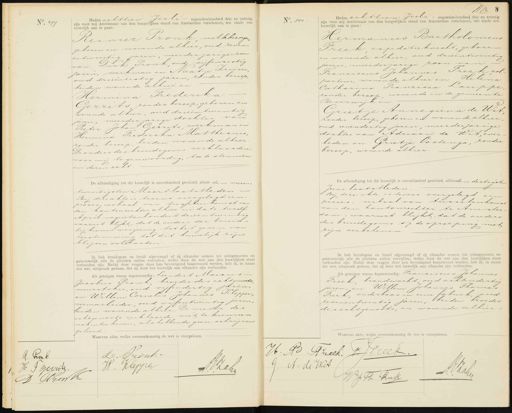 No. 499 Heden achttien Juli negentienhonderd drie en twintig zijn voor mij Ambtenaar van den burgerlijken stand van Amsterdam verschenen, ten einde een huwelijk aan te gaan: Reinier Pronk, melkbezorp geboren en wonende alhier, oud zeven- en twintig jaren, meerderjarige zoon van Dirk Pronk oud vijfenzestig jaren, werkman en Naatje Zuiver oud drieënzestig jaren, zonder beroep, beiden wonende alhier en Hermina Frederika Gerrits zonder beroep, geboren en wonende alhier, oud drieën twintig jaren, meerderjarige dochter van Pieter Johan Gerrits, werkman en Hermina Frederika Matthesus, zonder beroep, beiden wonende alhier. De ouders des bruidegoms verklaarden, voor mij tegenwoordig, toe te stemmen in dezen echt. De afkondiging tot dit huwelijk is onverhinderd geschied, alhier den vieren- twintigsten Maart laatstleden Bij deze akte is tevens overgelegd een proces-verbaal van tusschenkomst van den kantonrechter alhier in dato twaalf April negentienhonderd drieën twintig waaruit blijkt, dat de ouders der bruid- bij hunne wergering tot het geven van toestemming tot dit huwelijk zijn blijven volharden Ik heb bruidegom en bruid afgevraagd of zij elkander nemen tot echtgenooten en getrouwelijk alle de plichten zullen vervullen, welke door de wet aan den huwelijken staat verbonden zijn. Nadat deze vragen door hen bevestigend beantwoord werden, heb ik, in naam der wet, uitspraak gedaan, dat zij door het huwelijk aan elkander zijn verbonden Als getuigen waren tegenwoordig: Leendert Marius Jacobus Fronk broeder des echtgenoots, vuurstoker, oud vijfendertig jaren, en Willem Cornelis Johannes Klepper, veemarbeider, oud vijfentwintig jaren. beiden wonende alhier. De moeder des echtgenoots verklaarde niet te kunnen naamteekenen, als hebbende geen schrijven geleerd No. 500 MM 8 Heden achttien Juli negentienhonderd drie en twintig zijn voor mij Ambtenaar van den burgerlijken stand van Amsterdam verschenen, ten einde een huwelijk aan te gaan: Hermanus Bartholomeus Preek en peditieknecht, geboren en wonende alhier, oud drieëntwintig jaren, meerderjarige zoon van Franciscus Johannes Freek cob porteur, wonende alhier en Helena Catharina Francisca Lauppe zonder beroep, wonende in de gemeente Beverwijk en Grietje Annegiena de Wit zonder beroep, geboren en wonende alhier oud eenendertig jaren, meerderjarige dochter van Adriaan de Wit, over leden en Grietje Oostenga, zonder beroep, wonende alhier. De afkondiging tot dit huwelijk is onverhinderd geschied, alhierden dertigc Juni laatstleden Bij deze akte is tevens overgelegd een proces-verbaal van tusschenkomat van den kantonrechter te Amster dam, waaruit blijkt, dat de ouders des bruidegoms op de oproeping niet zijn verschenen Ik heb bruidegom en bruid afgevraagd of zij elkander nemen tot echtgenooten en getrouwelijk alle de plichten zullen vervullen, welke door de wet aan den huwelijken staat verbonden zijn. Nadat deze vragen door hen bevestigend beantwoord werden, heb ik, in naam der wet, uitspraak gedaan, dat zij door het huwelijk aan elkander zijn verbonden. As getuigen waren tegenwoordig: Franciscus Johannes Freek, brandwacht, oud achtendertig jaren, en Willem Johannes Thomas Preek, onderbaas in eene fabriek, oud zevenentwintig jaren, beiden broeder des echtgenoots, en wonende alhier Waarvan akte, welke overeenkomstig de wet is voorgelezen. L. Fronhi G. Pronk H Kleppa H J Goert ABZahe D Pronk H: B: Prelk J.Jvreek. A: de Weet. AVZake W.J. T Ruk