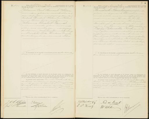No. 501. Heden achttien Juli negentienhonderd drie en twintig zijn voor mij Ambtenaar van den burgerhjken stand van Amsterdam verschenen, ten einde een huwelijk aan te gaan: Johann Carl Heinrich Kluen, assuradeur, geboren en wonende alhier, oud zesendertig jaren, meerderjarige zoon van Fredrik Hendrik Kluen en Wilhel. mina Heuer, beiden overleden, en Johanna Elisabeth Pauwels; Costiruminaarster, geboren en wonende alhier, oud veertig jaren, meerderjarige dochter van Josephus Pauwelsconierge en Elisabeth Alida heodora Duijves zonder beroep, beiden wonende alhier. De afkondiging tot dit huwelijk is onverhinderd geschied, alhier den zevenden dezer maand Ik heb bruidegom en bruid afgevraagd of zij elkander nemen tot echtgenooten en getrouwelijk alle de plichten zullen vervullen, welke door de wet aan den huwelijken staat verbonden zijn. Nadat deze vragen door hen bevestigend beantwoord werden, heb ik, in naam der wet, uitspraak gedaan, dat zij door het huwelijk aan elkander zijn verbonden. Als getuigen waren tegenwoordig: Cornelis Dorland, zon der beroep, oud zeven enzestig jaren, wonen de in de gemeente Haarlem, en Frederik Hendrik Kluen, broeder descchtgenoots, winkelier, oud vier en veertig jaren, wonen de alhier No. 502 Heden negentien Juli negentienhonderd drie en twintig zijn voor mij Ambtenaar van den burgerlijken stand van Amsterdam verschenen, ten einde een huwelijk aan te gaan Hendrik Reinbergen, caschoude geboren in de gemeente Winschoten, wo nende alhier, oud een en vyftig jaren, weduwnaar van Hendrika ter Veen meerderjarige zoon van Philippus Reinergen, zonder beroep wonende alhier, en Harmanna Abbas, overleden en Pietje Peternella Root, zonder be- roep, geboren en wonende alhier, oud negen en dertig jaren, weduwe van Antonie Franciscus Glastra, meerderjarige dochter van Sijmon Nicolaas Root, overleden, en Maria Antonia Cohet, zonder beroep wonende alhier De afkondiging tot dit huwelijk is onverhinderd geschied, alhier ten zeven ten dezer maand Ik heb bruidegom en bruid afgevraagd of zij elkander nemen tot echtgenooten en getrouwelijk alle de plichten zullen vervullen, welke door de wet aan den huwelijken staan verbonden zijn. Nadat deze vragen door hen bevestigend beantwoord werden, heb ik, in naam der wet, uitspraak gedaan, dat zij door het huwelijk aan elkander zijn verbonden Als getuigen waren tegenwoordig: Dirk de Zwart, zonder beroep, oud zestig jaren, en Willem Ukke„ man, zwager des echtgenoots, oud zesen veertig jaren, caféhouder, beiden wonende alhier Waarvan akte, welke overeenkomstig de wet is voorgelezen J. C.H. Kleue Celsland Joha C. Jauwels AtKeuen