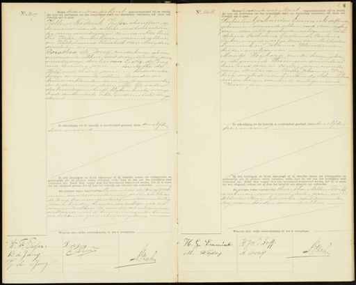 No. 207 Heden twee entwintig Aprif negentienhonderd vijf en twintig zijn voor mij Ambtenaar van den burgerlijken stand van Amsterdam verschenen, ten einde een huwelijk aan te gaan. 1 Willem Frederik Visser, chauffeur, ge boren enwonende alhier, oud twee entwin„ tig jaren, meerderjarige zoon van Atte Corne lis Visser, zonder beroep, wonende alhier en Wilhelmina Elisabeth van Muyjden, overleden, en Dorothia de Jong, zonder beroep, geboren enwonende alhier, oud vierentwintig jaren, meerderjarige dochter van Tjitte de Jong oud zeventig jaren, — en stafke de- Wolf, oud zestig jaren, — beidenzonder beroep en wonende alhier. De ouders der bruid verklaarden, voor mij tegenwoordig toe te stemmen in dezen echt. De vaders desbruidegoms heeft, blykens hierbij overge legde authentieke akte, in dezen echt toege Stemd De afkondiging tot dit huwelijk is onverhinderd geschied, alhier den elfden dezer maand Ik heb bruidegom en bruid afgevraagd of zij elkander nemen tot echtgenooten en getrouwelijk alle de plichten zullen vervullen, welke door de wet aan den huwelijken staat verbonden zijn. Nadat deze vragen door hen bevestigend beantwoord werden, heb ik, in naam der wet, uitspraak gedaan, dat zij door het huwelijk aan elkander zijn verbonden. Als getuigen waren tegenwoordig Laurentius de Jong werk man, oud zevenentwintig jaren, en Elias de Jong, tramconducteur oud zevenendertig Jaren, beiden broeder der echtgenoote en wonende alhier. De moeder der echtgenoote verklaarde niet te kunnen naamteekenen als hebbende geen schrijven geleerd No. 208 1 twintig Heden tweeentwintig April negentienhon zijn voor mij Ambtenaar van den burgerlijken stand van Amsterdam verschenen, ten einde een huwelijk aan te gaan: Hubertus Gerhardus Immink stoffeerd geboren en wonende alhier, oud, vierenvyftig jaren, van echt gescheiden echtgenoot van Helena Catharina Geertruida Paulona Diker, meerderjarige zoon van Lubbertus rmmink, en Johanna Kloosterman, beiden overleden, en Maatje Weijberg zonder beroep, geboren in de gemeente Vissingen, wonende al hier, oud twee en veertig jaren, meerder jarige dochter van Pieter Johannes Wey berg overleden, en Geertruida Schunselaa zonder beroep, wonende inde gemeente Vlissingen De afkondiging tot dit huwelijk is onverhinderd geschied, alhier den elfden dezer maand Ik heb bruidegom en bruid afgevraagd of zij elkander nemen tot echtgenooten en getrouwelijk alle de plichten zullen vervullen, welke door de wet aan den huwelijken staa- verbonden zijn. Nadat deze vragen door hen bevestigend beantwoord werden, heb ik, in naam der wet, uitspraak gedaan, dat zij door het huwelijk aan elkander zijn verbonden. Als getuigen waren tegenwoordig: Henri Johan Willem Dorf werkman, oud negenendertig jaren, en Albertus Rooy, lijnwerker, oud zevenender tig jaren, beiden wonende alhier 9 L. de Jing W. F Pissen, Com D de Jang AdZahy JH obv Jon H. JW: Dnsf H. Ge Emmintr AVzahy A Kouij M. Weijberg