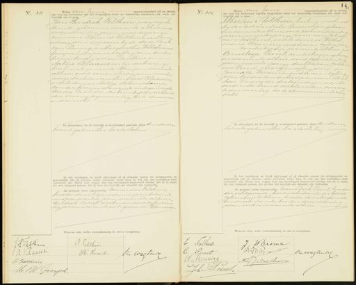No. 311 Heden vier Juni negentienhonderd vijf en twintig zijn voor mij Ambtenaar van den burgerlijken stand van Amsterdam verschenen, ten einde een huwelijk aan te gaan Jan Hendrik Felthuis, magazijnbe„ diende, geboren en wonende alhier, oud vierentwintig jaren, meerderjarige zoon van Barend Felthuis, oud twee enzestig jaren, oppasser bij de Stads Bank van Leening, en Margaretha Wilhelmina Grospeul, oud reven en vyftig jaren, zonder beroep, beiden wonende alhier, en Aaltje Klaassen, zonder beroep, ge boren in de gemeente Kampen, wonende alhier, oud eenendertig jaren, meerder jarige dochter van Leendert Klaassen, overleden, en Aaltje Schuurkamp, zonder beroep, wonende inde gemeente Breda De ouders des bruidegoms verklaar den, voor mij tegenwoordig toe te stemmen in dezen echt De afkondiging tot dit huwelijk is onverhinderd geschied, alhier den drieen twintigsten Mei laatstleden Ik heb bruidegom en bruid afgevraagd of zij elkander nemen tot echtgenooten en getrouwelijk alle de plichten zullen vervullen, welke door de wet aan den huwelijken staat verbonden zijn. Nadat deze vragen door hen bevestigend beantwoord werden, heb ik, in naam der wet, uitspraak gedaan, dat zij door het huwelijk aan elkander zijn verbonden, Als getuigen waren tegenwoordig: Bernardus Pelthuis, broeder des echtgenoots, magazijnbediende, oud zesentwintig jaren, wonende alhier, en Hendrik Zwart, werkman, oud vijfentwin„ tig jaren, wonende in de gemeente Warmerveer Waarvan akte, welke overeenkomstig de wet is voorgelezen. No. 312 Heden vier Juni negentienhonderd vijf en twintig, huwelijk aan te gaan: zijn voor mij Ambtenaar van den burgerlijken stand van Amsterdam verschenen, ten einde een Elbertus Nolthuis, leerling machinig bij de Nederlandsche Spoorwegen, geboren enwonende alhier, oud zevenentwintig jaren, meerderjarige zoon van Johan nes Nolthuis, overleden, en Wilhel„ mina Bruning, oud twee en vyftig jaren zonder beroep, wonende alhier, en Cornelisse Tunt, zonder beroep, geboren enwonende alhier, oud vyfentwintig jaren, meerderjarige dochter van Johan nes Tunt, oud vyf envijftig jaren, en Jannette Wiersma, oud twee en vijftig jaren, beiden zonder beroep en wonende al hier. De moeder desbruidegoms en de ouders der bruid verklaarden, voor mij tegenwoordig, toe te stemmen in dezer Ocht. De afkondiging tot dit huwelijk is onverhinderd geschied, alhier den drie en twintigsten Mei laatstleden Ik heb bruidegom en bruid afgevraagd of zij elkander nemen tot echtgenooten en getrouwelijk alle de plichten zullen vervullen, welke door de wet aan den huwelijken staat verbonden zijn. Nadat deze vragen door hen bevestigend beantwoord werden, heb ik, in naam der wet, uitspraak gedaan, dat zij door het huwelijk aan elkander zijn verbonden. Als getuigen waren tegenwoordig: Douwe Dirk Punt, broeder der echtgenoote, kantoorbediende, en Gerrit Johannes Nolthuis, broeder desechtgenoots kantoorbediende, beiden vierentwintig jaren oud en wonende alhier. P Telthier J. H. Telthurn A. Klaassen H. Zwart. Vn Woagtendor B Teluuis Me WW Grovsen E Noltuis J Wiersma DDrun C. Punt Van Wagtendor W. Bruning JJ Nolthann Joh: Surt
