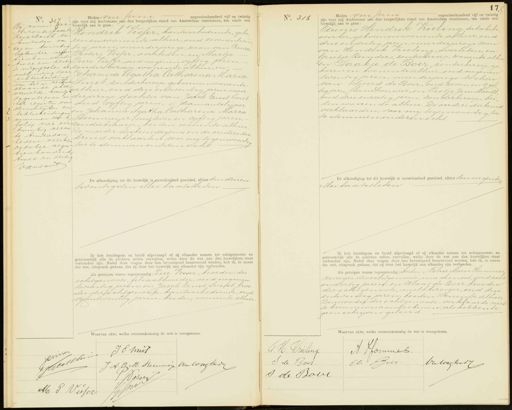 Bij vonnis der No 317 rrondispment Rechtank te Amsterdam van zes en twintig September negen- tienhonderd twee en dlstig is uitgesproben de ontbunding door echtscheiding van het in zevent staande akte vermelde huwelyjk Ingescheven in het register van Huwelijken en Echterbeidingn nmmer een b. folio vier en twintig verso te Amsterdam, heden veertien October negen tienhonderd twee en dertig vansout Heden vier Juni negentienhonderd vijf en twintig zijn voor mij Ambtenaar van den burgerlijken stand van Amsterdam verschenen, ten einde een huwelijk aan te gaan: Hendrik Visser, kantoorbediende, gebo„ ren en wonende alhier, oud zevenentwin tig jaren, meerderjarige zoon van Rinze Pieters Visser, overleden, en Martje Piers Vister, oud negenenvyftig jaren, zonder beroep, wonende alhier, en Johanna Agatha Catharina Maria Smit zonder beroep, geboren en wonende alhier, oud drie entwintig jaren, meer derjarige dochter van Jacob Ernst Smit oud vijftig jaren, diamantslijper en Johanna Agatha Catharina Maria Seenmeijer, oud twee en viftig jaren, zonder beroep, beiden wonende alhier De moeder desbruidegems en de ouders der bruid verklaarden, voor mij tegenwoord toe te stemmen in dezen echt. De afkondiging tot dit huwelijk is onverhinderd geschied, alhier den drieen twintigsten Mei laatstleden Ik heb bruidegom en bruid afgevraagd of zij elkander nemen tot echtgenooten en getrouwelijk alle de plichten zullen vervullen, welke door de wet aan den huwelijken staat verbonden zijn. Nadat deze vragen door hen bevestigend beantwoord werden, heb ik, in naam der wet, uitspraak gedaan, dat zij door het huwelijk aan elkander zijn verbonden. Als getuigen waren tegenwoordig: Vier Visser, broeder des echtgenoots, fitiaalhouder, oud negenen twintig jaren, en Jacob Ernst Smut, broe der der echtgenoote, kantoorbediende, oud vijfentwintig jaren, beiden wonende alhier Waarvan akte, welke overeenkomstig de wet is voorgelezen. No. 318 17 Heden vier puni negentienhonderd vijf en twintig zijn voor mij Ambtenaar van den burgerlijken stand van Amsterdam verschenen, ten einde een huwelijk aan te gaan: Teunis Hendrik Vrieling tabaksb werker, geboren en wonende alhier, ond drie endertig jaren, meerderjarige zoon van Hendrik Vrieling, overleden, en Grietje Runders, zonderberoep, wonende alhie en Saakje de Boer, zonder beroep, ge boren en wonende alhier, oud negenen twintig jaren, meerderjarige dochter van Sjoerd de Boer, oud zeven en vijf tig jaren landbouwer, en Pietje Jans Moedt- oud drie enzestig jaren, zonder beroep, bei den wonende alhier. De ouders der bruid verklaarden, voor mij tegenwoordig toe te stemmen in dezen echt De afkondiging tot dit huwelijk is onverhinderd geschied, alhier den negende Mei laatstleden Ik heb bruidegom en bruid afgevraagd of zij elkander nemen tot echtgenooten en getrouwelijk alle de plichten zullen vervullen, welke door de wet aan den huwelijken staat verbonden zijn. Nadat deze vragen door hen bevestigend beantwoord werden, heb ik, in naam der wet, uitspraak gedaan, dat zij door het huwelijk aan elkander zijn verbonden Als getuigen waren tegenwoordig: Anton Felise Marie Homme zwager des echtgenoots, machinist, oud acht endertig jaren, en Klaas de Boer, broeder der echtgenoote, melkbezorger, oud drie entwintig jaren, beiden wonende alhier De moeder der echtgenoote verklaarde niet te kunnen naamteekenen als hebbende geen schriven geleerd J C Mut Wooe J A C M Hteenmeije Venlorgtenden JJoer Inb M P Visser G.H. Trieling A Hommel C Boer J de Boer Ven Wagtende J de Bout