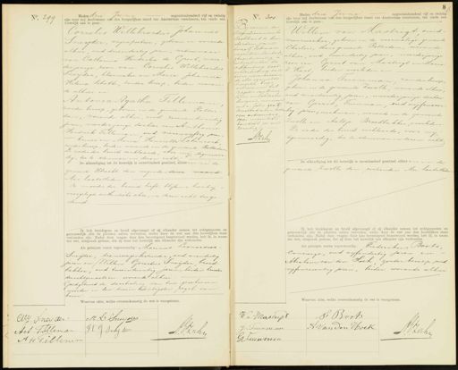 No. 299 Heden drie Juni negentienhonderd vijf en twintig zijn voor mij Ambtenaar van den burgerlijken stand van Amsterdam verschenen, ten einde een huwelijk aan te gaan: Cornelis Willebrordus Johannes Ineyder, wagenpoetser, geboren en wonende alhier, oud drieendertig jaren, weduwnaar van Catharina Hendrika de Groot, meer- derjarige zoon van Cornelis Willebrordus Sneijder kleermaker en Maria Johanna Helena Schotte, zonder beroep, beiden wonen- de alhier en Antonia Agatha Iilleman zonder beroep, geboren in de gemeente Rotter dam, wonende alhier, oud zevenentwintig jaren, meerderjarige dochter van Anthonie Hendrik Tilleman oud vierenvijftig jaren. kruier en Maria Henriette Schonroch zonder beroep, beiden wonende in de gemeente Rotterdam, De vader der bruid verklaarde, voor mij tegenwoor- dig, toe te stemmen in dezen echt De afkondiging tot dit huwelijk is onverhinderd geschied, alhier en in des gemeente Utrecht den negenden dezer maand. Mei laatstleden De moeder der bruid heeft, blijkens hierbij overgelegde authentieke akte, in dezen echt toege- stemd. Ik heb bruidegom en bruid afgevraagd of zij elkander nemen tot echtgenooten en getrouwelijk alle de plichten zullen vervullen, welke door de wet aan den huwelijken staat verbonden zijn. Nadat deze vragen door hen bevestigend beantwoord werden, heb ik, in naam der wet, uitspraak gedaan, dat zij door het huwelijk aan elkander zijn verbonden. Als getuigen waren tegenwoordig: Marinus Leonardus Sneijder, transwagenbestuurder oud eenendertig jaren en Willem Gerardus Sneijder brood bakker, oud tweeëntwintig jaren, beiden broeder der echtgenootsen wonende alhier Goedgekeurd de doorhaling van twee geschreven woorden en den tweeëen twintigsten Jegel van boven Waarvan akte, welke overeenkomstig de wet is voorgelezen. No. 300 Bij vouwis der Arrondinements Rechtbank te Am. sterdam van twaalf Februari negentienhonderd zesentwintig in uitgesprokende ontbuiding dood echtscheiding van het in nevensstaan de akte vermelde huwelijk Euge schreven in het register van tuwe. liken en Echtschei dingen, nunne een a, folio zes te Amsterdam, heden een entwintig mei negentien honderd zes en twintig Azahy Heden drie Juni negentienhonderd vijf en twintig zijn voor mij Ambtenaar van den burgerlijken stand van Amsterdam verschenen, ten einde een huwelijk aan te gaan: Willem van Mastrigt smid vuurwerker, geboren in de voormalige gemeente Charlois, thans gemeente Rotterdam, wonende alhier, oud tweeëndertig jaren, meerderjarige zoon van Gerrit van Mastrigt en Maria ’t Vart, beiden overleden en Johanna Tuinman zonder beroep, geboren in de gemeente dwolle wonende alhier oud eenentwintig jaren, meerderjarige dochter van Gerrit Tuinman oud vijfenveer entig jaren, werkman, wonende in de gemeente Zwolle en Aaltje Broodbakker, overleden De vader der bruid verklaarde, voor mij tegenwoordig, toe te stemmen in dezen echt De afkondiging tot dit huwelijk is onverhinderd geschied, alhier en in den gemeente zwolle den zestienden Mei laatstleden Ik heb bruidegom en bruid afgevraagd of zij elkander nemen tot echtgenooten en getrouwelijk alle de plichten zullen vervullen, welke door de wet aan den huwelijken staat verbonden zijn. Nadat deze vragen door hen bevestigend beantwoord werden, heb ik, in naam der wet, uitspraak gedaan, dat zij door het huwelijk aan elkander zijn verbonden Als getuigen waren tegenwoordig: Frederikus Boots Concurge, oud vijfendertig Jaren en Abraham van den Hoek zonder beroep, oud vijfenzeventig jaren, beiden wonende alhier Waarvan akte, welke overeenkomstig de wet is voorgelezen. AJ Ina der M L. Smides W.G Inh der Act Pilleman ABzahy A H Villemaan W v Masturgs P Boots J. Tuinman A Van den Hoek AZake GTunman