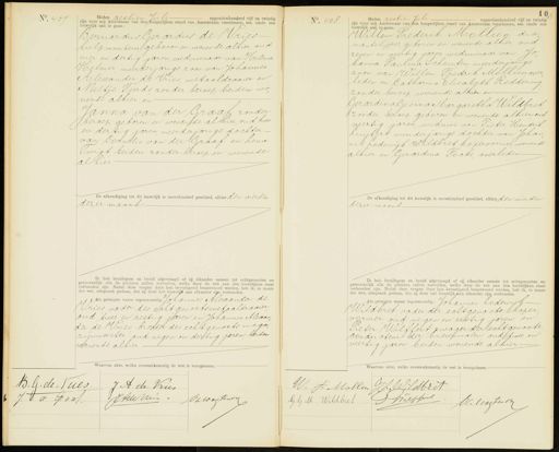 No. 407 Heden zestien Juli negentienhonderd vijf en twintig huwelijk aan te gaan: zijn voor mij Ambtenaar van den burgerlijken stand van Amsterdam verschenen, ten einde een Bernardus Gerardus de Vries hulpmonteur geboren en wonende alhier, oud vier en dertig jaren, weduwnaar van Helena Helmer meerderjarige zoon van Johannes Alexander de Vries, metaaldraaier en Neeltje Teerds zonder beroep, beiden wo nende alhier en Janna van der Graaf, zonder beroep, geboren en wonende alhier oud twee en dertig jaren, meerderjarige dochter van Cornelis van der Graaf en Lend wigt beiden zonder beroep en wonende alhier De afkondiging tot dit huwelijk is onverhinderd geschied, alhier den vierdin dezer maand Ik heb bruidegom en bruid afgevraagd of zij elkander nemen tot echtgenooten en getrouwelijk alle de plichten zullen vervullen, welke door de wet aan den huwelijken staat verbonden zijn. Nadat deze vragen door hen bevestigend beantwoord werden, heb ik, in naam der wet, uitspraak gedaan, dat zij door het huwelijk aan elkander zijn verbonden. ds getuigen waren tegenwoordig: Johannes Alexander dl Vries vader des echtgenootsmet aaldraaier, oud twee en zestig jaren en Johannes Alexas der de Vries broeder des echtgenoots maga¬ zijnmeester oud negen en dertig jaren beiden wonende alhier. Waarvan akte, welke overeenkomstig de wet is voorgelezen. No. 408 Heden zestien Juli negentienhonderd vijf en twintig zijn voor mij Ambtenaar van den burgerlijken stand van Amsterdam verschenen, ten einde een huwelijk aan te gaan Willem Frederik Mollien dia mantslijper, geboren en wonende alhier, oud zeven en veertig jaren weduwnaar van Jo hanna Paulina Schouten meerderjarige zoon van Willem Fredrik Mollien over leden en Catharina Elisabeth Reddering zonder beroep, wonende alhier en Gerardina Gesina Margaretha Wildbret zonder beroep geboren en wonende alhier ond veertig jaren weduwe van Pieter Hendrik Kuyfers meerderjarige dochter van Johan nes Lodewik Wildbret kopervormer wonende alhier en Gerardina Focke, overleden. De afkondiging tot dit huwelijk is onverhinderd geschied, alhier den vierden alzer maand Ik heb bruidegom en bruid afgevraagd of zij elkander nemen tot echtgenooten en getrouwelijk alle de plichten zullen vervullen, welke door de wet aan den huwelijken staat verbonden zijn. Nadat deze vragen door hen bevestigend beantwoord werden, heb ik, in naam der wet, uitspraak gedaan, dat zij door het huwelijk aan elkander zijn verbonden. ds getuigen waren tegenwoordig: Johannes Lodewijk Wildbret vader der echtgenoote koper vormer oud negen en zestig jaren en Pieter Wilffert zwager der echtgenoote Condrcteur der brievenmalen oud twee en veertig jaren, beiden wonende alhier. Waarvan akte, welke overeenkomstig de wet is voorgelezen. B.A. dePues J A de Vries AdeVen Vatoogtende J. A d: Gaaf W. S Mollen JZ. Gldbret WWelffert G.G. M. Wildbret Oclvogtindt