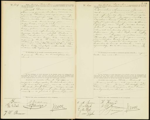 No. 604 Heden dertig September negentienhonderd vijf en twintig zijn voor mij Ambtenaar van den burgerlijken stand van Amsterdam verschenen, ten einde een huwelijk aan te gaan: Jacob Daams, kantoorbediende, geboren in de gemeente Arnhem, wonende in de gemeente Heerlen, oud negenentwintig jaren, meerderjarige zoon van JacobDaams, overleden en Johanna Wilhelmina Braam, oud drieënzestig jaren zonder beroep, wonende alhier en Henrica Elisa Pals, zonder. beroep, geboren in de gemeente Vinlo, wonende alhier, oud vijfentwintig jaren, meerderjarige dochter van Jacob Hubert Paes, stukadoor en Maria Catharina Volters, zonder beroep, beiden wonende in de gemeente Venlo. De moeder des bruidegoms verklaarde, voor mij tegenwoordig, toe testem wen in dezen eche. De ouders der bruid hebben blijkens hierbij overgelegde authentieke akte; in dezen echt toegestemd De afkondiging tot dit huwelijk is onverhinderd geschied, alhier en en de gemeente Heerlen den twaalfden dezer maand. Ik heb bruidegom en bruid afgevraagd of zij elkander nemen tot echtgenooten en getrouwelijk alle de plichten zullen vervullen, welke door de wet aan den huwelijken staat verbonden zijn. Nadat deze vragen door hen bevestigend beantwoord werden, heb ik, in naam der wet, uitspraak gedaan, dat zij door het huwelijk aan elkander zijn verbonden. Als getuigen waren tegenwoordig: Arend Groen, zwager des echtgenoots, kantoorbediende; oud tweeëndertig jaren, wonende alhier en Hendrik Jozef Elzinga, zwager der echtgenoote, winkelchef, oud achtendertig jaren, wonende in de gemeente 's Gravenhage Waarvan akte, welke overeenkomstig de wet is voorgelezen. No. 605 Heden dertig September - negentienhonderd vijf en twintig zijn voor mij Ambtenaar van den burgerlijken stand van Amsterdam verschenen, ten einde een huwelijk aan te gaan: Cornelis Marinus Jansen werkman, geboren en wonende alhier oud vijfentwintig jaren, meerderjarige zoon van Anthonie Jansen, overleden en Cornelia Maria Slok oud zevenen vijftig jaren, zonder beroep, wonende alhier en Grietje van Dijk zonder beroep geboren in de gemeente Zwolle, wonende alhier, oud eenentwintig jaren, meerderjarige dochter van Jan van Dijk, oud vijftig jaren,brigadier van politie en Hendrika Hanja oud negenen veertig jaren, zonder beroep, beiden wonende alhier. De moeder des bruidegoms en de ouders der bruid verklaarden, voor m tegenwoordig, toe te stemmen in dezen echt De afkondiging tot dit huwelijk is onverhinderd geschied, alhier den negen tienden dezer maand Ik heb bruidegom en bruid afgevraagd of zij elkander nemen tot echtgenooten en getrouwelijk alle de plichten zullen vervullen, welke door de wet aan den huwelijken staat verbonden zijn. Nadat deze vragen door hen bevestigend beantwoord werden, heb ik, in naam der wet, uitspraak gedaan, dat zij door het huwelijk aan elkander zijn verbonden. Als getuigen waren tegenwoordig: Willem Frederik Jansen, werkman, oud negenentwintig. jaren en Jan Jansen, brandstoffenhan delaar, oud eenendertig jaren, beiden broeder des echtgenoots, en wonende alhier. Jaarvan Eaam A. Grven HJilzingo H. E. Paes. hevol J.W. Braam C: M. Jansen H Hanja G v Dijk W S Jannen Revol C. Mo SlokJansen van Dijk
