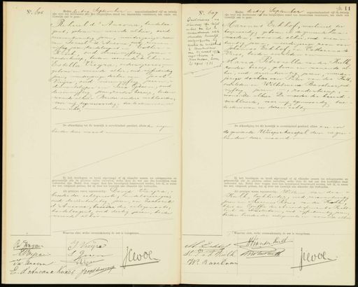 No. 606 Heden dertig September negentienhonderd vijf en twintig zijn voor mij Ambtenaar van den burgerlijken stand van Amsterdam verschenen, ten einde een huwelijk aan te gaan Rehuel d' Ancona, handelsagent, geboren en wonende alhier, oud zevenentwintig Jaren, meerderjarige zoon van Isroel d' Ancona oud zevenen vijftig jaren, handelsagent en Esther Knoek oud arieënviftig jaren zonder beroep, beiden wonende alhier en Estella Pueijra, onderwijzeres geboren en wonende alhier, oud vyfentwintig jaren, meerderjarige dochter van Jacob Vieijra, oud vierenvijftig jaren,diamantslijper en Sara Groen, oud drieënvijftig Jaren, zonder beroep beiden wonende alhier Beider ouders verklaarden voor mij tegenwoordig, toe te stemmen in dezen echt De afkondiging tot dit huwelijk is onverhinderd geschied, alhier den negentienden dezer maand Ik heb bruidegom en bruid afgevraagd of zij elkander nemen tot echtgenooten en getrouwelijk alle de plichten zullen vervullen, welke door de wet aan den huwelijken staat verbonden zijn. Nadat deze vragen door hen bevestigend beantwoord werden, heb ik, in naam der wet, uitspraak gedaan, dat zij door het huwelijk aan elkander zijn verbonden. Als getuigen waren tegenwoordig: David Cierjra, broeder der echtgenoote, handelsreiziger, oud drieëntwintig jaren, en Zacharie d' Ancona, broeder des echtgenoots, handelsagent oud dertig jaren, beiden wonende alhier Waarvan akte, welke overeenkomstig de wet is voorgelezen. No. 600 Ontlinding, na scheiding van tafel en besl van het E nevenstaande akte vermelde huwelijk, uitgestroken vorrdis der rchtsenk te Amsterdam van 23 maart 1992 ingeschreven tus terdam, heden, 21 April 1972 R „ Heden dertig September negentienhonderd vij en twintig zijn voor mij Ambtenaar van den burgerlijken stand van Amsterdam verschenen, ten einde een huwelijk aan te gaan; Marinus Eekhof, machinist ter koopvaardij, geboren in de gemeente Leeuwarden, wonende alhier, oud vieren „twintig Jaren meerderjarige zoon van Vries, beiden overleden en Johannes Eekhof en Catharina de Maria Petronella van der Kulk zonder beroep, geboren en wonende al hier, oud driientwintig jaren meerder. jarige dochter van Pieter van der Kulk overleden en Wilhelmina Bavelaar, oud viftig jaren, zonder beroep wonende alhier. De moeder der bruid verklaarde, voor mij tegenwoordig toe te stemmen in dezen echt De afkondiging tot dit huwelijk is onverhinderd geschied, alhier en en de gemeente Weesperkarspel den negen tienden dezer maand Ik heb bruidegom en bruid afgevraagd of zij elkander nemen tot echtgenooten en getrouwelijk alle de plichten zullen vervullen, welke door de wet aan den huwelijken staan verbonden zijn. Nadat deze vragen door hen bevestigend beantwoord werden, heb ik, in naam der wet, uitspraak gedaan, dat zij door het huwelijk aan elkander zijn verbonden Als getuigen waren tegenwoordig: Willem van der Rulk boekhouder, oud zevenentwintig jaren en Marinus Petrus van der Kulk klerk ter Griffie der Arrondissements Recht bank te Amsterdam, oud vijfentwintig jaren beiden broeder der echtgenoote en wonende alhier -Waarvan akte, welke overeenkomstig de we BTmme J Veeijra Nreipa S. Gvren Heol vee AaalzeJegen Een dArcare Kuoer Jregummen An EekkotLanderhult M. Pos Kulk Asterutk Wol W. Barelaar