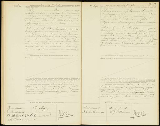 No. 641 Heden eenentwintig October negentienhonderd vijf en twintig zijn voor mij Ambtenaar van den burgerlijken stand van Amsterdam verschenen, ten einde een huwelijk aan te gaan: Hijman van Beem, diamantslijper, geboren alhier, wonende te Antwerpen in Belgie oud negenentwintig jaren, meerder jarige zoon van Meijer van Beem, overleden en Branca Bleekveld, oud vijfenzestig jaren, - zonder beroep, wonende- alhier en Elisabeth Bacharach, zonder beroep, geboren en wonende alhier, oud twintig jaren, minderjarige dochter van Mozes Bacharach, oud vijfenveertig jaren -diamantslijper, en Aaltje Mug, oud vierenveertig Jaren, zonder beroep, beiden wonende alhier. De moeder des bruidegoms en de ouders der bruid verklaarden, voor mij tegenwoordig, toe te stemmen in dezen echt De afkondiging tot dit huwelijk is onverhinderd geschied, alhierdan tienden dezer maand. Ik heb bruidegom en bruid afgevraagd of zij elkander nemen tot echtgenooten en getrouwelijk alle de plichten zullen vervullen, welke door de wet aan den huwelijken staat verbonden zijn. Nadat deze vragen door hen bevestigend beantwoord werden, heb ik, in naam der wet, uitspraak gedaan, dat zij door het huwelijk aan elkander zijn verbonden. Als getuigen waren tegenwoordig: Samuel van Praag koopman oud zevenendertig jaren, en- Samuel van Beem, broeder des echtgenoots, koopman, oud eenendertig jaren, beiden wonende alhier Waarvan akte, welke overeenkomstig de wet is voorgelezen. No. 642 3 Heden eenentwintig October - negentienhonderd vijf en twintig zijn voor mij Ambtenaar van den burgerlijken stand van Amsterdam verschenen, ten einde een huwelijk aan te gaan: Christiaan Johannes Smit. steenhouwer, geboren en wonende alhier oud achtendertig jaren, meerderjarige zoon van Teunis Smit en Johanna Alijda van Amerongen, beiden overleden en Alida Cornelia Botterman, zonder beroep, geboren en wonende alhier oud vierendertig jaren, van echt gescheiden echtgenoote van Willem van Baal meerderjarige dochter van Hendricus Tran ciscus Botterman loopknecht, en Johanna Hendrika van Ormondt, zonder beroep, beiden wonende alhier. De afkondiging tot dit huwelijk is onverhinderd geschied, alhier den tienden dezer maand. Ik heb bruidegom en bruid afgevraagd of zij elkander nemen tot echtgenooten en getrouwelijk alle de plichten zullen vervullen, welke door de wet aan den huwelijken staat verbonden zijn. Nadat deze vragen door hen bevestigend beantwoord werden, heb ik, in naam der wet, uitspraak gedaan, dat zij door het huwelijk aan elkander zijn verbonden Als getuigen waren tegenwoordig: Willem Karel Smit broeder des echtgenoots, steenhouwer, oud negenendertig jaren en Christiaan Johannes Botterman, broeder der echtgenoote, houder van een wasch- en strijkenrichting, oud zesendertig jaren, beiden wonende alhier Waarvan akte, welke overeenkomstig de wet is voorgelezen. H. Van Beem. A Muy E Baeharach S: vanriag Klool B Bleekdeld pake M Bachalach chS Smit W.K. Smit C.J. Bottennm A.C. Botterman Heol