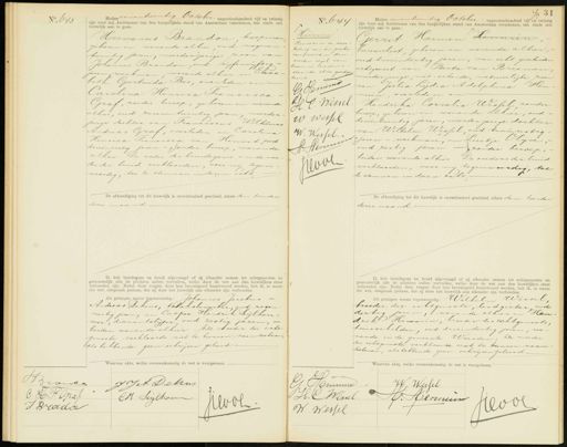 No. 643 Heden eenentwintig October negentienhonderd vijf en twintig zijn voor mij Ambtenaar van den burgerlijken stand van Amsterdam verschenen, ten einde een huwelijk aan te gaan Hermanus Brandon koopman, geboren en wonende alhier, oud negenen twintig jaren, meerderjarige zzoon van Johannes Brandon, oud vijfenvijftigjaren werkman wonende alhier en Elisabetp Geertruida Bos, overleden en Carolina Henrica Francisca Graf, zonder beroep, geboren en wonende alhier, oud zevenentwintig jaren, merder jarige dochter van Franciscus Wilhelmus Andreas Graf, overleden en Carolina Henrica Francisca van Hemert, oud drieënzestig jaren - zonder beroep, wonende alhier. De vader des bruidegoms en de moe der der bruid verklaarden, voor mij tegen woordig, toe te stemmen in dezen echt De afkondiging tot dit huwelijk is onverhinderd geschied, alhier den tienden dezer maand Ik heb bruidegom en bruid afgevraagd of zij elkander nemen tot echtgenooten en getrouwelijk alle de plichten zullen vervullen, welke door de wet aan den huwelijken staat verbonden zijn. Nadat deze vragen door hen bevestigend beantwoord werden, heb ik, in naam der wet, uitspraak gedaan, dat zij door het huwelijk aan elkander zijn verbonden Als getuigen waren tegenwoordig: Johannes Jacobus Andreas Dekens, tabaksbewerker, oud zeven veertig jaren, en Casper Hendrik Leijlhouwer, diamantslijper oud zestig jaren, beiden wonende alhier. De moeder der echt genoote verklaarde niet te kunnen vaamteekenen; als hebbende geen schrijven geleerdWaarvan akte, welke overeenkomstig de wet is voorgelezen. No. 644 Hennuin Renvooi en de doorhaling van één geschreven woord in den vierden regel van boven in nevens staande akte goedge G Vermi A H. C. Wessel W wessel W. Wessel. S: Senmis 3Heden eenentwintig October negentienhonderd vijf en twintig zijn voor mij Ambtenaar van den burgerlijken stand van Amsterdam verschenen, ten einde een huwelijk aan te gaan Gerrit Harmen Hennin Oureaulist, geboren en wonende alhier, oud tweeendertig jaren, van echt gescheiden meerderjarige, met - erkende, natuurlijke zzoon echtgenoot van Berta van Breemen van Julia Lijdia Adolphina Hen nuin, overleden en Hendrika Cornelia Wessel zonder beroep, geboren en wonende alhier, oud drieëntwintig jaren, meerderjarige dochter van Wilhelm Wessel, oud tweeënzestig jaren - werkman, en Luitje Vlijve. oud zestig jarenzonder beroep, beiden wonende alhier. De ouders der bruid verklaarden, voor mij tegenwoordig, toe te stemmen in dezen echtDe afkondiging tot dit huwelijk is onverhinderd geschied, alhier den tienden dezer maand. Ik heb bruidegom en bruid afgevraagd of zij elkander nemen tot echtgenooten en getrouwelijk alle de plichten zullen vervullen, welke door de wet aan den huwelijken staat verbonden zijn. Nadat deze vragen door hen bevestigend beantwoord werden, heb ik, in naar der wet, uitspraak gedaan, dat zij door het huwelijk aan elkander zijn verbonden Als getuigen waren tegenwoordig: Wilhelm Wessel, broeder der echtgenoote, loodgieter, oud dertig jaren, wonende alhier en Hen. drik Henmin, broeder des echtgenoots, huisschilder, oud drieëndertig jaren, wonende in de gemeente Woerden, De moeder der echtgenoote verklaarde niet te kunnen naam teekenen, als hebbende geen schrijven geleerd Waarvan akte, welke overeenkop Brands J JA Dekens C. HP: Opaf CH Seijlhou Hool. JBrada G. Temmme W„ Wessel H.C. Wessel C. Henneun jevol WW Wessel