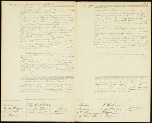 No. 594 Heden vierentwintig September negentienhonderd vijf en twintig zijn voor mij Ambtenaar van den burgerlijken stand van Amsterdam verschenen, ten einde een huwelijk aan te gaan: Ludweg Leonard Tromp stucddoor geboren te Laar in Duitschland, wonende. alhier, oud zevenentwintig jaren, meerder jarige zoon van Petrus Tromp oud achten vyftig jaren, stucadoor en Atonetta Veldt, oud vierenvyftig jaren. zonder beroep, beiden wonende alhier en Maria Margaretha Haages, zonder beroep, geboren en wonende alhier, oud twintig jaren, minderjarige dochter van Jacob Franciscus Haages, overleden en Johanna Maria Eenschoten, oud. vijfenveertig jaren,zonder beroep, wonende alhier, De ouders des bruidegoms en de moeder der bruid verklaarden, voor mij tegenwoordig, toe te stemmen in dezen echt De afkondiging tot dit huwelijk is onverhinderd geschied, alhier en in de gemeente Brunssum den vierden April laatstleden Bruidegom en bruid verklaarden, de eerste met toestemming der tweede bij deze te erkennen een kind genaamd: Antoon Focke Peter Haages, geboren alhier op negentien Mei negentienhonderd vijf- entwintig Ik heb bruidegom en bruid afgevraagd of zij elkander nemen tot echtgenooten en getrouwelijk alle de plichten zullen vervullen, welke door de wet aan den huwelijken staat verbonden zijn. Nadat deze vragen door hen bevestigend beantwoord werden, heb ik, in naam der wet, uitspraak gedaan, dat zij door het huwelijk aan elkander zijn verbonden. Als getuigen waren tegenwoordig: Pocke Gorter, schipper, oud tweeënvijftig jaren en Rikke Eenschoten, oom der Echtgenoote werkman oud tweeendertig jaren, beiden wonende alhier. Waarvan akte, welke overeenkomstig de wet is voorgelezen. No. 598 Heden negenentwintig September Negentienhonderd vijf en twintig zijn voor mij Ambtenaar van den burgerlijken stand van Amsterdam verschenen, ten einde een huwelijk aan te gaan Leopold Rijxman, koopman, geboren en wonende alhier, oud tweeën twintig jaren, meerderjarige zoon van Abraham Rijx man, oud achtenveertig jaren, antiguair en Duifje van Hes, oud zevenenveertig jaren — zonder beroep, beiden wonende al hier en Carolina Heiligers, zonder beroep, geboren en wonende alhier, oud eenentwin tig jaren, meerderjarige dochter van Salomon Heiligers, oud achtenveertig jaren, koopman en Elisabeth de Haan oud vieren veertig jaren, zonder beroep beiden wonende alhier. Beider ouders ver klaarden, voor mij tegenwoordig, toe te- stemmen in dezen echt De afkondiging tot dit huwelijk is onverhinderd geschied, alhier den negen- tienden dezer maand. Ik heb bruidegom en bruid afgevraagd of zij elkander nemen tot echtgenooten en getrouwelijk alle de plichten zullen vervullen, welke door de wet aan den huwelijken staat verbonden zijn. Nadat deze vragen door hen bevestigend beantwoord werden, heb ik, in naam der wet, uitspraak gedaan, dat zij door het huwelijk aan elkander zijn verbonden. Als getuigen waren tegenwoordig: Gerrit Rijxman, koopman, oud vijfentwintig jaren en Salomon Rijxman, koopman, oud vier entwintig jaren, beiden broeder des echt- genoots, en wonende alhier LL. Tromp JM Eenschoten M M Haages J Gorter A ah P: Tromp REenschok O Veldt L Rijeran J. Heiligers J Dommest 6 Heiligers E. de Haar. G Kiijer A. Rijsman D Van Hes MMynren