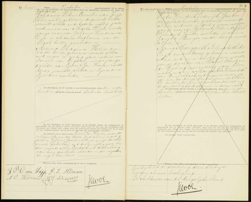 No. 604 veren ategen october veenenended d en ud. Heden en D zijn voor mij Ambtenaar van den burgerlijken stand van Amsterdam verschenen, ten einde een Johannes Petrus Cornelis van Lijp, kleermaker geboren in de gemeente Leiden wonende alhier oud twee en vijftig jaren weduwnaar van Marta Reizer meerder„ jarige zoon van Johannes Hendricus van Lijp en Antonia Catharina van der sloot beiden overleden en Anna Clasina Homan zonder beroep geboren en wonende alhier, oud negen en veertig jaren weduwe van Cornelis van Rigteren meerderjarige dochter van Gerrit Jan Höman zonder beroep, wonende alhier en Gerardina Geerkens, overleden. De afkondiging tot dit huwelijk is onverhinderdgeschied, alhier den negen tienden dezer maand September laatstleden Ik heb bruidegom en bruid afgevraagd of zij elkander nemen tot echtgenooten en getrouwelijk alle de plichten zullen vervullen, welke door de wet aan den huwelijken staat verbonden zijn. Nadat deze vragen door hen bevestigend beantwoord werden, heb ik, in naam der wet, uitspraak gedaan, dat zij door het huwelijk aan elkander zijn verbonden. Als getuigen waren tegenwoordig: Gerrit Jan Koman vader dl echtgenoote zonder beroep oud acht en zeventig jaren en Johannes Jacobus Meyer zwager der echt genoote fabrikant oud drie en vyftig jaren ben den wonende alhier Goedgekeurd de doorhaling van twee geschreven woorden in den negentien den regel van boven Wearanalie veke orereentonig de velie veoregeren. No. 605 Piik aan te gaan voor mij Anblenaar van den burgerlijken stand van Amsterdam verschonen, dan Pieter Hendrik Lodewik Jonker schacoladebewerker, geboren en wonende alhier oud vier en dertig jaren meerder jarige zoon van Johannas Christofffel Hendrik Jonker overleden en Anna Jacoba Burger, zonder beroep wonende alpier en Amna Margaretha Elisabeth de Rijk zonder beroep geboren en wonende alhier oud zes en twintig jaren meerder jarige dochter van Karel Christiaan de Rijk oud zeven en zestig jaren kleer maker en Anna Margaretha Elisabeth van Busschbach oud negen en zestig ran zonder beroep, beiden wonende alhier. De ouders derbruid verklaarden voor mij tegenwoordig toe te stummen in dezen echt De afkondiging tot dit huwelijk is onverhinderd geschied, alhier den negen renden dezer maand September laatst, leden. Ik heb bruidegom en bruid afgevraagd of zij elkander nemen tot echtgenooten en getrouwelijk alle de plichten zullen vervullen, welke door de wet aan den huwelijken staat verbonden zijn. Nadat deze vragen door hen bevestigend beantwoord werden, heb ik, in naam der wet, uitspraak gedaan, dat zij door het huwelijk aan elkander zijn verbonden Als getuigen waren tegenwoordig: J.P: C van Lijp G. J. Homan A C Höman JJ MeyjerJ levol: keurd de oorhaling dezer bladzijde wegens abusieve beschrijving. De Ambtenaar van den Burgerlijken Stand HoOl