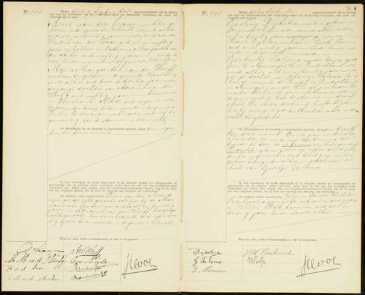 No. 594 ber negentienhonderd vijf en twintig Heden dertig zijn voor mij Ambtenaar van den burgerlijken stand van Amsterdam verschenen, ten einde een huwelijk aan te gaan: Arie van der Daan winkelier, ge boren in de gemeente Utrecht wonende alhier. oud vier en twintig jaren meerderjarige zoon van Hendrik van der Laan oud een en viftig jaren en balleur en Catharina Margaretha van den Anker oud vijftig jaren zonder be roep beiden wonende in de gemeente Utrecht en Maria Margaretha van der Werff, verkoopster, geboren in de gemeente Haarlem wo nende alhier, oud twee en twintig jaren, meer derjarige dochter van Adrianus van der Werff oud vijftig jarenAmmeri en Cornelia van Norde oud negen en veer v/ jaren zonder beroep beiden wonende in de gemeente huilen. Beider ouders verklaarden voor mij te genwoordig toe te stemmen in dezen echt De afkondiging tot dit huwelijk is onverhinderd geschied, alhier den negen tienden dezer maand Ik heb bruidegom en bruid afgevraagd of zij elkander nemen tot echtgenooten en getrouwelijk alle de plichten zullen vervullen, welke door de wet aan den huwelijken staat verbonden zijn. Nadat deze vragen door hen bevestigend beantwoord werden, heb ik, in naam der wet, uitspraak gedaan, dat zij door het huwelijk aan elkander zijn verbonden, Als getuigen waren tegenwoordig: Frans van den Brend zwager des echtgenoots schrijver bij de Neder landsche Spoorwegen oud acht en twintig jaren en Adrianus van der Werff broeder der echtgenoote kantoorbediende oud vijf en twin„ tig jaren, beiden wonende in de gemeente Utrecht. No. 595 Heden dertig September vg zijn voor mij Ambtenaarvan den burgerlijken stand van Amsterdam verschenen, ten einde een huwelijk aan te gaan: Gosting Dijkstra monteur, geboren in de gemeente Leeuwarden wonende alhier, oud ze ver en twintig jaren meerderjarige zoon van Karste Dijkstra overleden en Gephe Tosmu oud zes en veertig jaren zonder beroep, wo- nende in de gemeente Leenwarden en Gertrude Palsma zonder beroep, gebo ren te Nassenerfurth in Duitschland wo nende alhier oud zes en twintig jaren meerder jarige dochter van Johannes Palsma land bouwer, wonende te Hostel in Duitschland en Annegje van der Vlugt, overleden De moeder desbruidegoms verklaarde voor mij tegenwoordig toe te stemmen in dezen Acht De vader derbruid heeft blijken hierbij overgelegde authentieke akte in deze echt toegestemd. De afkondiging tot dit huwelijk is onverhinderd geschied, alhier den twaalf den dezer maand Brindegom en bruid ver klaarden de eerste met toestemming der tweede bij deze te erkennen een kind, genaamd Harsten, geboren alhier op vijf en twintig sep tember negentienhonderd twintig en mi het geboortenregister alhier ingeschreven als kind van Geertje Solsma. Ik heb bruidegom en bruid afgevraagd of zij elkander nemen tot echtgenooten en getrouwelijk alle de plichten zullen vervullen, welke door de wet aan den huwelijken staat verbonden zijn. Nadat deze vragen door hen bevestigend beantwoord werden, heb ik, in naam der wet, uitspraak gedaan, dat zij door het huwelijk aan elkander zijn verbonden. i Als getuigen waren tegenwoordig: Johannes Cornelis Wilhelmus Frankvoort, sigarenmaker, oud een en dertig jaren en Willem olk koopman, oud drie en dertig jaren, beiden wonende alhier KKaan AnWeff M M red oerff Cerotade Sievol H v d Luun van den ane C M v de Anker Rvandervid ke overeenkomstig de wet is voorgelezen. JCW Frankevort DDijketra G: Galswa WVoltje Ol plo J Posmur
