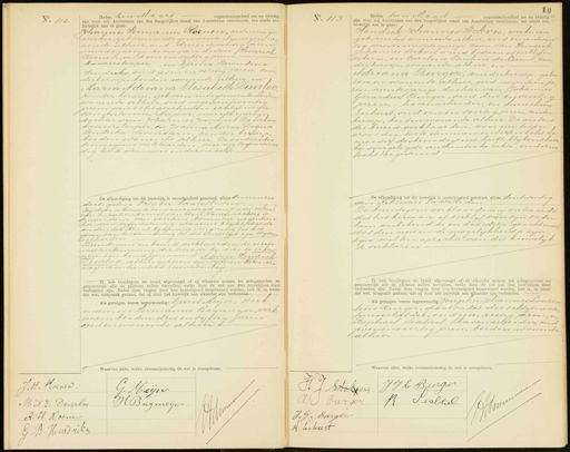No. 112 Heden hei Maart negentienhonderd zes en twintig zijn voor mij Ambtenaar van den burgerlijken stand van Amsterdam verschenen, ten einde een huwelijk aan te gaan: Johannes Hermanus Koenen, cartonnage werker, geboren inde gemeente Nymegen, wi nende alhier, oud drieentwintig jaren meerderjarige zoon van Anten Henrich Koenen, oud een en vyftig jaren kasterslooper, en Gezina Berendina Hendriks oud zeven en veertig jaren, zon„ derberoep, beiden wonende alhier, en Maria Adriana Elisabeth Deurloc zonder beroep, geboren inde gemeente Leiden wonende alhier, oud negenentwintig jaren, van echtgescheiden echtgenoote van Antonius Majoor, meerderjarige, dochter van Johannes Josephus Deurloo kassierslooper, en Joanna Maria Digna Hendrika Sevenstern, zonder beroep, beiden wonende alhier, De ouders des bruidegoms verklaarden voor mij tegenwoor dig toe te stemmen in dezen echt. De afkondiging tot dit huwelijk is onverhinderd geschied, alhier teneen en dertigsten October taatstleden Bij deze akte is tevens overgelegd een proces-verbaal van tusschenkomst van den Kantonrechter te Amsterdam, van veertien November negentien honderd vijfentwintig waaruit blijkt, dat de ouders der bruid bij hunne wergering tot het geven van testemming tot dit huwelyk zijn blyven volharden. Bruidegom en bruid verklaarden, de eerste met toestemming der tweede bij deze te erken nen, een kind genaamd: Anton Heinrich Deurloo, alhier geboren en vyftien Februari negentienhonderd zesentwintig Ik heb bruidegom en bruid afgevraagd of zij elkander nemen tot echtgenooten en getrouwelijk alle de plichten zullen vervullen, welke door de wet aan den huwelijken staat verbonden zijn. Nadat deze vragen door hen bevestigend beantwoord werden, heb ik, in naam der wet, uitspraak gedaan, dat zij door het huwelijk aan elkander zijn verbonden. Als getuigen waren tegenwoordig: Gerrit Meyer, werk man, en Hermanus Bagmeijer, werk man, beiden drie enviftig jaren oud en wonende alhier Waarvan akte, welke overeenkomstig de wet is voorgelezen. NNo. 113 Heden tien Maart— zijn voor mij Ambtenaar van den burgerlijken stand van Amsterdam verschenen, ten einde een huwelijk aan te gaan: Hendrik Johannes Stokvis, werkman geboren en wonende alhier, oud eenentwin tig jaren, meerderjarige zoon van Hendrik Johannes Stokvis, wiens bestaan of verblijf on zeker is, en Caroline Pauline de Leeuw, Don derberoep, wonende alhier, en Adriana Burger, zonder beroep, gebo ren en wonende alhier, oud negentien jo ren, minderjarige dochter van Johannes Gerardus Burger, oud drie en veertig jaren, -havenarbeider, en Annechiën verhart oud een en veertig jaren, zonder beroep, beiden wonende alhier. De ouders der bruid verklaarden, voor mij tegen woordig, toe te stemmen in dezen echt Di moeder desbruidegems heeft, blykens hier„ bij overgelegde authentieke akte, in dezen echt toegestemd De afkondiging tot dit huwelijk is onverhinderd geschied, alhier den twintig sten Februari laatstleden De bruidegom verklaarde mij onder eede dat het bestaan of verblijf van zijn vader hem onbekend is en dat deze geacht moe worden niet in de mogelykheid te zijn zijn wil ten opzichte van dit huwelijk te verklaren Ik heb bruidegom en bruid afgevraagd of zij elkander nemen tot echtgenooten en getrouwelijk alle de plichten zullen vervullen, welke door de wet aan den huwelijken staat verbonden zijn. Nadat deze vragen door hen bevestigend beantwoord werden, heb ik, in naam der wet, uitspraak gedaan, dat zij door het huwelijk aan elkander zijn verbonden. Als getuigen waren tegenwoordig Josephus Johannes Louren tius Burger, groot vader der echtgenoote huisschilder, oud zesenzestigjaren, en Raphael Sealtiel havenarbeider, oud zevenenveertig jaren, beiden wonende alhier Waarvan akte, welke overeenkomstig de wet is voorgelezen. J H. Roenen. J. Heijn H. Bagmeijer MAE. Deurloo. A: H. Koene J B Hendrik JJ Le Burgeer JJ Stokwis R. Sealtiel ABBurger JSom J.J. Burger A Eerkart