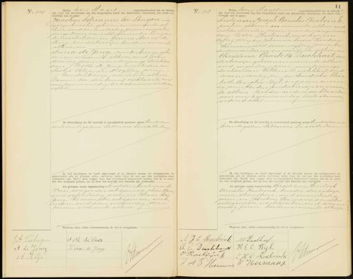 NNo. 114 Heden hen Maart negentienhonderd zes en twintig zijn voor mij Ambtenaar van den burgerlijken stand van Amsterdam verschenen, ten einde een huwelijk aan te gaan: Jacobus Adrianus ter Lingen, ma gazijnknecht, geboren en wonende al¬ hier, oud eenendertig jaren, meerder„ jarige zoon van Adrianus ter Lingen huisschilder, en Gesina Maria de leng, zonderberoep, beiden wonende alhier, en Anna de Jong, zonder beroep, gebo ren en wonende alhier, oud zezen twintig jaren, meerderjarige dochter van Botte de Jong, overleden, en Aukje Rlip, oud vyftig jaren, zonder beroep, wonende alhier De moeder der bruid verklaarde, voor mij tegenwoordig, toe te stemmen in deze echt. De afkondiging tot dit huwelijk is onverhinderd geschied, alhier den zeven entwintigsten Februari laatstleden Ik heb bruidegom en bruid afgevraagd of zij elkander nemen tot echtgenooten en getrouwelijk alle de plichten zullen vervullen, welke door de wet aan den huwelijken staat verbonden zijn. Nadat deze vragen door hen bevestigend beantwoord werden, heb ik, in naam der wet, uitspraak gedaan, dat zij door het huwelijk aan elkander zijn verbonden. Als getuigen waren tegenwoordig: Arnoldus Martinus de Vries zwager der echtgenoote, chanffeur oud vijfendertig jaren, en Klaas De Jong, broeder der echtgenoote, werk man, oud zeven entwintig jaren„ beiden wonende alhier Waarvan akte, welke overeenkomstig de wet is voorgelezen. No. 115 Heden tien Maart twin zijn voor mij Ambtenaar van den burgerlijken stand van Amsterdam verschenen, ten einde een huwelijk aan te gaan: Antonius Joseph Cornelis Roelvink poelier geboren en wonende alhier, ond achtentwintig jaren, meerderjarige zoon van Pieter Roelvink, oud negen en viftig jaren en Johanna Anna Theodoro Hermans, oud vierenvijftig jaren, bei denzonder beroep en wonende alhier en Christina Charlotte Duchhart zon derberoep, geboren en wonende alhier oud negentien jaren, minderjarige dochter van Willem Duchhart, oud twee en veertig jaren en Hendrika Eliso beth Cornelia Byl, oud zeven en veer tig jaren beiden zonder beroep en wonen de alhier. Beider onders verklaarden voor mij tegenwoordig, toe te stemmen indezen echt De afkondiging tot dit huwelijk is onverhinderd geschied, alhier den zeven en twintigsten Februari laatstleden Ik heb bruidegom en bruid afgevraagd of zij elkander nemen tot echtgenooten en getrouwelijk alle de plichten zullen vervullen, welke door de wet aan den huwelijken staat verbonden zijn. Nadat deze vragen door hen bevestigend beantwoord werden, heb ik, in naam der wet, uitspraak gedaan, dat zij door het huwelijk aan elkander zijn verbonden. Als getuigen waren tegenwoordig: Christiaan Hendrik Cornelis Roewink, broeder des echtge noots, chauffeur, oud eenendertig jaren, en Jacobus Hermans, oom des echtgenoots, nachtwaker, oud twee en zestig jaren, beiden wonende alhier welke overeenkomstig de wet is voorgelezen A M de Vried J A Terluynn