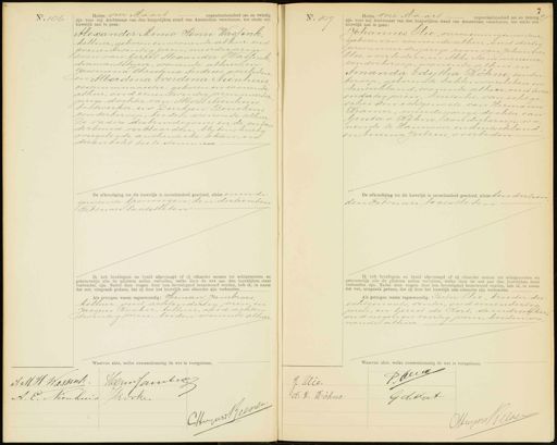 No. 106 Heden vier Maart enhonderd zes en twin huwelijk aan te gaan: zijn voor mij Ambtenaar van den burgerlijken stand van Amsterdam verschenen, ten einde een Alexander Minio Henri Wassink, kellner, geboren en wonende alhier, oud zevenentwintig jaren, meerderjarige zoon van Gerrit Alexander Wassink diamantslijper, wonende alhier, en Jacomma Christina Andries, overleden en Alberdina Everdina Nienhuis costiumnaarster, geboren en wonende alhier, oud eenentwintig jaren, meerder jarige dochter van Albert Nienhuis bootwerker, en Durkjen Beuckens zonder beroep, beiden wonende alhier De vader desbruidegoms en de ouder derbruid verklaarden, blijkens hierbij overgelegde authentieke akten, in dezen echt toe te stemmen De afkondiging tot dit huwelijk is onverhinderd geschied, alhier en in de gemeente Groningen, den dertienden Februari laatstleden. Ik heb bruidegom en bruid afgevraagd of zij elkander nemen tot echtgenooten en getrouwelijk alle de plichten zullen vervullen, welke door de wet aan den huwelijken staat verbonden zijn. Nadat deze vragen door hen bevestigend beantwoord werden, heb ik, in naam der wet, uitspraak gedaan, dat zij door het huwelijk aan elkander zijn verbonden Als getuigen waren tegenwoordig: Herman Jambroes. kellner, oud achtendertig jaren en Jacques Rooker, keller, oud achten twintig jaren, beiden wonende alhier Waarvan akte, welke overeenkomstig de wet is voorgelezen. No. 107 er zijn voor mij Ambtenaar van den burgerlijken stand van Amsterdam verschenen, ten eindee huwelijk aan te gaan: Johannes Olie, verwarmingsmonk geboren en wonende alhier oud dertig jaren, meerderjarige zoon van Johanne Elie, overleden, en Akte Nammensma zonder beroep, wonende alhier, en Amanda Edytha Röhne zonder beroep, geboren te Dahlenwarsteben in Duitschland, wonende alhier, oud twe endertig jaren Duitsche, van echtge scheiden echtgenoote van Hermann Kramer, meerderjarige dochter van Gustav Röhne, zonderberoep, wo nende te Hannover in zuitschland en Emma Julius, overleden. De afkondiging tot dit huwelijk is onverhinderd geschied, alhier zen dertien den Februari laatstleden Ik heb bruidegom en bruid afgevraagd of zij elkander nemen tot echtgenooten en getrouwelijk alle de plichten zullen vervullen, welke door de wet aan den huwelijken staat verbonden zijn. Nadat deze vragen door hen bevestigend beantwoord werden, heb ik, in naam der wet, uitspraak gedaan, dat zij door het huwelijk aan elkander zijn verbonden. Als getuigen waren tegenwoordig: Pieter Olie, broeder de echtgenoots, venter, oud eenendertig jaren, en Gerrit de Kort, ste endrukker oud negen en veertig jaren, beiden wo nende alhier. Heeren Jamubrr A M.H Wassink. A. E. Nieuhuis Rooken