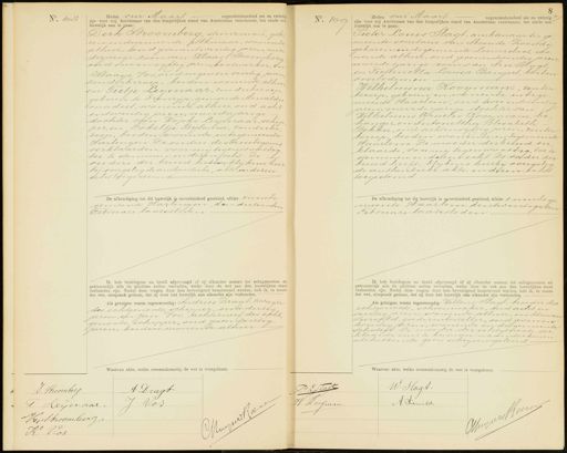 No. 108 Heden vier Maart negentienhonderd zes en twintig zijn voor mij Ambtenaar van den burgerlijken stand van Amsterdam verschenen, ten einde een huwelijk aan te gaan: Derk Stroomberg, stuurman, gebo ren indegemeente Alkmaar, wonende alhier, oud zevenentwintig jaren, meer derjarige zoon van Klaas Stroomberg oud vier en vyftig jaren, bostwerker, en Klaasje Vos, oud negen en veertig jaren zonderberoep, beiden wonende alhier en Sietje Leyenaar, zonder beroep geboren te Dronrijp, gemeente Menaldu madeel, wonende alhier, oud acht entwintig jaren, meerderjarige dochter van Wopke Leijenaar, schin per, en Fokeltje Bijlsma, zonder be roep, beiden wonende in de gemeente Harlingen. De ouders desbruidegoms verklaarden, voor mij teeenwoordig toe te stemmen in dezen echt. De ouders der bruid hebben blijkens hier bij overgelegde authentieke, akte in dezen echt toegestemd De afkondiging tot dit huwelijk is onverhinderd geschied, alhier en inde gemeente Hartingen, den dertienden Februari laatstleden Ik heb bruidegom en bruid afgevraagd of zij elkander nemen tot echtgenooten en getrouwelijk alle de plichten zullen vervullen, welke door de wet aan den huwelijken staat verbonden zijn. Nadat deze vragen door hen bevestigend beantwoord werden, heb ik, in naam der wet, uitspraak gedaan, dat zij door het huwelijk aan elkander zijn verbonden. Als getuigen waren tegenwoordig: Andries Dragt, zwager des echtgenoots schipper, oud dertig jaren, en Jan Vos, achterneel des echtgenoots schipper, oud zesen veertig jaren, beiden wonende alhier. No. 109 Heden vier Maart zijn voor mij Ambtenaar van den burgerlijken stand van Amsterdam verschenen, ten eindeteen huwelijk aan te gaan: Pieter Louis Slagt, ambtenaar ter ge meente secretarie van Abcoude- Froostdi geboren in de gemeente Loenersloot, wo nende alhier, oud zevenentwintig jaren meerderjarige zoon van Arie Slagt en Pieternella Louisa Bangert, beiden overleden, en Wilhelmima Rooymans, zonder beroep, geboren en wonende inde ge meente Haarlem, oud twee entwintig jaren, meerderjarige dochter van Wilhelmus Cornelis Rooymans, be hanger, en Antonettha Elisabeth Bekker, oud achtenvijftig jaren, zonder beroep, beiden wonende inde gemeente Haarlem. De moeder derbruid ver klaarde, voor mij tegenwoordig toe te stemmen indezen echt. De vader der bruid heeft, blijkens hierbij overgeleg de authentieke akte, indezen echt toegestemd. De afkondiging tot dit huwelijk is opverhinderd geschied, alhier enin de ge meente Haarlem, den twintigsten Februari laatstleden. Ik heb bruidegom en bruid afgevraagd of zij elkander nemen tot echtgenooten en getrouwelijk alle de plichten zullen vervullen, welke door de wet aan den huwelijken staat verbonden zijn. Nadat deze vragen door hen bevestigend beantwoord werden, heb ik, in naam der wet, uitspraak gedaan, dat zij door het huwelijk aan elkander zijn verbonden. als getuigen waren tegenwoordig: Willem Slagt, broeder des echtgenoots, schoenmaker, oud acht en veertig jaren, wonende alhier, en Adriaar Sierveld, goederenbesteller, oud zeven en twintig jaren, wonende in de gemeente Schoten De moeder der echtgenoote ver klaarde niet te kunnen naamteekenen als hebbende geen schriven geleerd Waarvan akte, welke overeenkomstig de wet is voorgelezen. A: Dragt D. Hroomberg J Vos t Leijenaar C C K.tbroomberg. K Vos W. Slagt. B P Slagt A. Vierveld W. Koosman