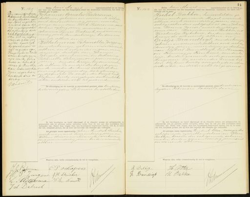 No. 121 Bij vonnisderAfrron ditssements Rechtbank te Amsterdam, van zes April negentien honderd drie en der tig is uitgesproken de ontbinding door echtscheiding van het in nevens staande akte vermelde huwelijk. Ingeschreven in het register van Huwellijken en Echt. scheidingen, nummer een a„ folio twee en twintig verso te Amsterdam, heden veertien. Juninegentien, honderd drie en dertig: vansoert Heden tien Maart negentienhonderd zes en twintig zijn voor mij Ambtenaar van den burgerlijken stand van Amsterdam verschenen, ten einde een huwelijk aan te gaan: Johannes Cornelis Pietersma, kellner, geboren en wonende alhier oud twee entwintig jaren, meerder „jarige zoon van Dirk Pietersma, oud twee en viftig jaren, monteur, en Johanna Agnes Dabzoek, oud zevenen veertig jaren zonder beroep, beiden vo nende alhier, en Wilhelmina Petronella Jurgen zonder beroep, geboren en wonend alhier, oud negentien jaren, min derjarige dochter van Johannes Jurgens, steenhouwer, en Catharina Petronella Scheepers, oud zesenveertig jaren, - zonder beroep, beiden wonen de alhier. De ouders des bruidegom en de moeder der bruid verklaarden voor mij tegenwoordig, toe te stemmen in dezen echt. De vader der bruid heeft blykens hierbij overgelegde authentieke akte, indezen echt toegestemd. De afkondiging tot dit huwelijk is onverhinderd geschied, alhier den zeven entwintigsten Februari laatstleden. Ik heb bruidegom en bruid afgevraagd of zij elkander nemen tot echtgenooten en getrouwelijk alle de plichten zullen vervullen, welke door de wet aan den huwelijken staat verbonden zijn. Nadat deze vragen door hen bevestigend beantwoord werden, heb ik, in naam der wet, uitspraak gedaan, dat zij door het huwelijk aan elkander zijn verbonden. Als getuigen waren tegenwoordig: Johan Hendrik Stricker werkman, oud twee endertig jaren, en Willem Christiaan Nieuwolt, werkman oud zevenendertig jaren, beiden wonende alhier Waarvan akte, welke overeenkomstig de wet is voorgelezen. No. 122 Heden tien Maart 9 twintig u zijn voor mij Ambtenaar van den burgerlijken stand van Amsterdam verschenen, ten einde eenhuwelijk aan te gaan Riekel Bakker, huisschilder, ge boren inde gemeente Meppel, wonende alhier, oud vierendertig jaren, van echtgescheiden echtgenoot van Johan na Keina Janse, meerderjarige zoon van Harmannus Bakker, en Wicchertje Rykeboer, beiden zonder beroep en wonende alhier, en Grietje Brandligt zonder beroep geboren en wonende alhier, oud achten twintig jaren, meerderjarige dochte van Ribert Brandligt, landbouwer en Temmigje Fernhout, zonder be roep, beiden wonende inde gemeente Hoogeveen. De ouders der bruid heb ben, blykens hierbij overgelegde authen tieke akte, indezen echt toegestemd De afkondiging tot dit huwelijk is onverhinderd geschied, alhier rentivon tigsten Februari laatstleden Ik heb bruidegom en bruid afgevraagd of zij elkander nemen tot echtgenooten en getrouwelijk alle de plichten zullen vervullen, welke door de wet aan den huwelijken staat verbonden zijn. Nadat deze vragen door hen bevestigend beantwoord werden, heb ik, in naam der wet, uitspraak gedaan, dat zij door het huwelijk aan elkander zijn verbonden. Als getuigen waren tegenwoordig: Hendrik Otter, zwager de echtgenoots, rywselhandelaar, en Klaas Bakker, broeder des echtgenoots, schoen maker, beiden zeven en veertig jaren oud en wonende alhier. vereenkomst. de wet is voorgelezen. ieturma C P schapers W. S C Burgens. JH Stricker W PetenmaW. Vr. Nieuwt JA Datzoek D Bakkez H: Otter H. Bakker. Gr Brandeigt