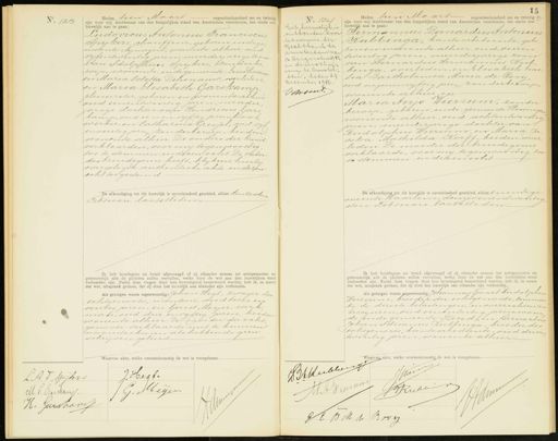 No. 123 Heden tien Maart negentienhonderd zes en twintig zijn voor mij Ambtenaar van den burgerlijken stand van Amsterdam verschenen, ten einde een huwelijk aan te gaan Ludovicus Antonius Franciocus Spijkers, chauffeur, geboren inde ge meente Nymegen, wonende alhier oud vyfentwintig jaren, meerderjarige zoon van Adolphuis Spijkers, zonder beroep, wonende in de gemeente Eindhoven en Maria Coletta Dehenauw, overleden en Maria Elisabeth Garskamp plisseerster, geboren en wonende alhier oud eenentwintig jaren, meerder jarige dochter van Hendricus Gars kamp, oud een en vyftig jaren boot werker, en Catharina Gressel, oud vijf enveertig jaren zonder beroep, beiden wonende alhier. De ouders der bruid verklaarden, voor mij tegenwoordig toe te stemmen indezen echt. De vader desbruidegoms heeft, blykens hierbij overgelegde authentieke akte mdezen echt toegestemd: De afkondiging tot dit huwelijk is onverhinderd geschied, alhier den zesden Februari laatstleden Ik heb bruidegom en bruid afgevraagd of zij elkander nemen tot echtgenooten en getrouwelijk alle de plichten zullen vervullen, welke door de wet aan den huwelijken staat verbonden zijn. Nadat deze vragen door hen bevestigend beantwoord werden, heb ik, in naam der wet, uitspraak gedaan, dat zij door het huwelijk aan elkander zijn verbonden. Als getuigen waren tegenwoordig Johan Hegt, zwager des echtgenoots, monteur, oud twee en veertig jaren, en Gerrit Meyer, werkman, oud drie envyftig jaren, beiden wonende alhier. De moeder der echt genoote verklaarde niet te kunnen naamteekenen als hebbende geen schrijven geleerdWaarvan akte, welke overeenkomstig de wet is voorgelezen. No. 124 No. 124 Dit huwelijk is ontbouden door het vorns der Rechtbank te amsterdam van /3 Augustus 1942 en de inschrijving te Amsterdun, heten 29 December 1942 Oomboert. Heden tien Maart negen a twintig zijn voor mij Ambtenaar van den burgerlijken stand van Amsterdam verschenen, ten einde een huwelijk aan te gaan: Hermannus Bernardus Antonius Rubbinga, kantoorbediende, gebo ren en wonende alhier, oud vieren twintig jaren, meerderjarige zoon van Bernardus Hermannus Kub, binga, overleden, en Elisabeth Eme lia Bartholoméa Maria de Rooij oud negenenvijftig jaren, zonder beroep wonende alhier, en Maria Anje Viersum, zonder beroep, geboren inde gemeente Vlissingen wonende alhier, oud achtentwintig jaren, meerderjarige dochter van Rudolphus Hiersum en Maria Ja coba Mathilda Rorff, beiden over leden. De moeder des bruidegoms verklaarde, voor mij tegenwoordig tot te stemmen indezen echt. De afkondiging tot dit huwelijk is onverhinderd geschied, alhier en inde ge meente Haarlem, denzevenentwintig sten Februari laatstleden Ik heb bruidegom en bruid afgevraagd of zij elkander nemen tot echtgenooten en getrouwelijk alle de plichten zullen vervullen, welke door de wet aan den huwelijken staat verbonden zijn. Nadat deze vragen door hen bevestigend beantwoord werden, heb ik, in naam der wet, uitspraak gedaan, dat zij door het huwelijk aan elkander zijn verbonden Als getuigen waren tegenwoordig Johannus Sjaart Audolphus Wiersum, broeder der echtgenoote, commen bij de directe belastingen, invoerrechten en accunzen, oud eenendertig jaren, wonen de inde gemeente Beesd, en Bernardus Johan Adrianus Rubbinga, broeder des echtgenoots, kantoorbediende, oud drieen twintig jaren, wonende alhier J. Hegt L A D Apijkers G. Meijer M:C. Garskamp 1 H Garskamp eden J: A: Wieudu JRRuba 1. E E BM de Rovy