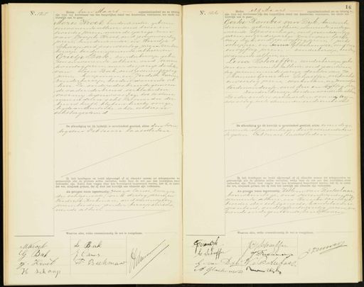 No. 123 Heden tien Maart negentienhonderd zes en twintig zijn voor mij Ambtenaar van den burgerlijken sland van Amsterdam verschenen, ten einde een huwelijk aan te gaan: Mozes Kroet, huidenzouter, geboren en wonende alhier, oud twee en twintig jaren, meerderjarige zoon van Joseph Rroet, oud zevenenveertig jaren, huidenzouter, en Hentje schaap, oud zes enveertig jaren, zonder beroep, beiden wonende alhier, en Grietje Bak, zonder beroep, gebo ren enwonende alhier, oud vieren twintig jaren, meerderjarige dochter van Leon Bak, oud zevenen zestig jaren, - koopman, en Judith Vurm zonder beroep, beiden wonende al hier. De ouders des bruidegoms en de vader derbruid verklaarden. voor mij tegenwoordig, toe te stem„ men in dezen echt De moeder der bruid heeft, blykens hierbij overge„ legde authentieke akte, indezen echt toegestemd De afkondiging tot dit huwelijk is onverhinderd geschied, alhier den tiin tigsten Februari laatstleden Ik heb bruidegom en bruid afgevraagd of zij elkander nemen tot echtgenooten en getrouwelijk alle de plichten zullen vervullen, welke door de wet aan den huwelijken staat verbonden zijn. Nadat deze vragen door hen bevestigend beantwoord werden, heb ik, in naam der wet, uitspraak gedaan, dat zij door het huwelijk aan elkander zijn verbonden. Als getuigen waren tegenwoordig: Jesaya Canes, Zwager des echtgenoots Soud dertig jaren, en Frederik Beekman, oud eenenvyftig jaren, beiden zonder beroep en wi nende alhier Waarvan akte, welke overeenkomstig de wet is voorgelezen. No. 126 „ elf Maart ne d zes en twintig huwelijk aan te gaan: zijn voor mij Ambtenaar (van den burgerlijken stand van Amsterdam verschenen, ten einde een Gerke Romkes van Dijk, kantoorbe diende, geboren alhier, wonende inde ge meente slravenhage, oud zesentwintig jaren, meerderjarige zoon van Gerte van Dijk, oud zesenvijftig jaren, - jacht schipper, en Anna Glashouwer, ond vier envijftig jaren, zonderberoep, beiden wonende alhier, en Lena Schaeffer, zonder beroep, gebo ren en wonende alhier, oud zesentwin„ tig jaren, meerderjarige dochter van 70„ Jhannes Gerardus Schalfter, ondacht en veertig jaren, werkman, en Jannetje Ferdinandusse, oud drie en vijftig jare zonder beroep, beiden wonende alhier Beider ouders verklaarden, voor mij tegen woordig, toe te stemmen indezen echt De afkondiging tot dit huwelijk is onverhinderd geschied, alhier eninde ge meente sravenhage, denzevenentwin tigsten Februari laatstleden, Ik heb bruidegom en bruid afgevraagd of zij elkander nemen tot echtgenooten en getrouwelijk alle de plichten zullen vervullen, welke door de wet aan den huwelijken staat verbonden zijn. Nadat deze vragen door hen bevestigend beantwoord werden, heb ik, in naam der wet, uitspraak gedaan, dat zij door het huwelijk aan elkander zijn verbonden. Als getuigen waren tegenwoordig: Willem van Butzelaar bouwkundige, oud vierentwintig jari wonende alhier, en Romke van Dijk broeder des echtgenoots, handelscorre spondert, oud vyfentwintig jaren, wo nende inde gemeente rindhoven Waarvan akte, welke overeenkomstig de wet is voorgelezen. L Bak MKrogl G Bak J. Canes