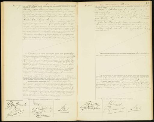 No. 127 Heden vyftien Maart negentienhonderd zes en twintig zijn voor mij Ambtenaar van den burgerlijken stand van Amsterdam verschenen, ten einde een huwelijk aan te gaan: Roelof van Mourik, schoenmaker, geboren in de gemeente Kamerik, wonende alhier, oud drie en veertig jaren, van echt gescheiden echtgenoot van Heiltje de Kruif, meerderjarige zoon van Corne lis van Mourik, en Krintje Kroes, beiden over leden, en Atsia Elisabeth Heer, zonderberoep, geboren enwonende alhier, oud vierentwintig jaren meer derjarige dochter van Stefanus Hier, koop, man, en Jacomina Hendrika Johanna Ham mega, zonder beroep, beiden wonende alhier Bij deze akte is tevens overgelegd een proces- verbaal vantusschenkomst van den Kantonrechter te kun sterdam waarwit blykt, dat de ouders der bruid op de oproeping niet zijn verschenen. Voorts is overgelegd eene geneeskundige verkl ring waaruit blijkt dat de bruid niet in staat is, zich ter voltrekking van haar huwe lyk naar het huis der gemeente te begeven- De afkondiging tot dit huwelijk is onverhinderd geschied, alhier enindige meente zoest, den negenden Januari laatstleden De bruidegom verklaarde met toestemming der moe der bruid bij deze te erkennen, een kind genaamd: Johannes Hendricus Heer alhier geboren op vyf Juni negentienhonderd vierentwintig; zynde dit kind reeds door de moeder erkend bij akte op acht October negentienhonderd vierentwintig ver„ leden door den Ambtenaar van den Burgerlijken stand alhier Bruidegom en bruid verklaarden, de eerste met toestemming der tweede bij deze te erkennen een kind genaamd: Elizabeth Jacoba Krijntje Heer alhier geboren op vyfentwintig Februari negentienhonderd zesentwintig Ik heb bruidegom en bruid afgevraagd of zij elkander nemen tot echtgenooten en getrouwelijk alle de plichten zullen vervullen, welke door de wet aan den huwelijken staan verbonden zijn. Nadat deze vragen door hen bevestigend beantwoord werden, heb ik, in naam der wet, uitspraak gedaan, dat zij door het huwelijk aan elkander zijn verbonden. Als getuigen waren tegenwoordig Johannes Hendricus Terwee schrijver, oud drie en dertig jaren, Johannes Hendricus Wilhelmus Recourt, bode, oud drie en veertig jaren, Hijmman Metzelaar, schrijver, oud vier entwintig jaren, Lambertus Adrianus Christiaan Elfe ring schoenimaker, oud negen en veertigjaren, Gerrit de Winter, klerk, oud achtentwintig jaren en 70„ hannes Faber, bode, oud eenenveertig jaren, allen wonende alhier, zijnde dit huwelijk voltrok ken in het huisstaande Eerste Helmers sttaat nummer honderd vier Waarvan akte, welke overeenkomstig de wet is voorgelezen. NNo. 128 Heden zeventien Maart negentienhonderd zes en twintig in zijn voor mij Ambtenaar van den burgerlijken stand van Amsterdam verschenen, ten einde een huwelijk aan te gaan: Jacob Schaap, handelsagent, gebo ren inde gemeente Ouderater, wonen de alhier, oud twee en dertig jaren. meerderjarige zoon van Josua Schaap en Betje Mossel, beiden zonder beroep en wonende alhier, en Titske Rudolphus, zonder beroep, ge boren en wonende alhier, oud eenender tig jaren, meerderjarige niet erkende nahuirlijke dochter van Jitske Rudolph overleden De afkondiging tot dit huwelijk is onverhinderd geschied, alhier den zesden dezer maand Ik heb bruidegom en bruid afgevraagd of zij elkander nemen tot echtgenooten en getrouwelijk alle de plichten zullen vervullen, welke door de wet aan den huwelijken staat verbonden zijn. Nadat deze vragen door hen bevestigend beantwoord werden, heb ik, in naam der wet, uitspraak gedaan, dat zij door het huwelijk aan elkander zijn verbonden. als getuigen waren tegenwoordig: Alexander Schaap, broe der des echtgenoots, handelsagent, oud zes en dertig jaren, en Johannes Adolf Frederik Renardel de Lavaletse accountant, oud achtentwintig jaren, beiden wonende alhie W Mekelaa P van Houk L A CEfering H C Heer Merin Azahg Gaewvinter Fansstervant EOee AVnaah. Skaaf JRudolphen AVzah 1