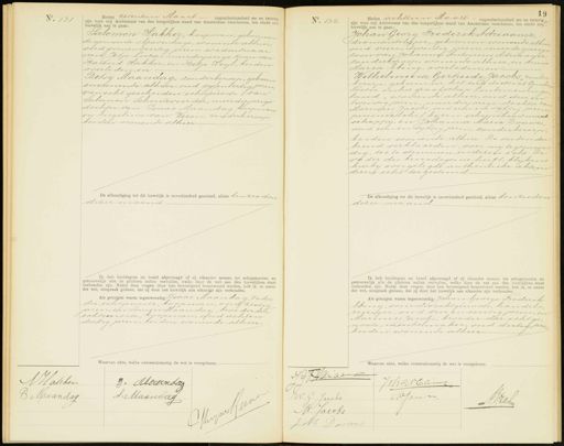 No. 131 Heden zeventien Maart negentienhonderd zes en twintig zijn voor mij Ambtenaar van den burgerlijken stand van Amsterdam verschenen, ten einde een huwelijk aan te gaan: Salomon Hakker, koopman, geboren in de gemeente sGravenhage, wonende alhier. oud zevenenveertig jaren, weduwnaar van Jetje Luza, meerderjarige zoon van Barend Hakker, en Betje Keijl, beiden overleden, en Betsij Maandag, zonder beroep, geboren en wonende alhier, oud vyfendertig jaren, van echt gescheiden echtgenoge van Salomon Schuitevoerder, meerderjarige dochter van Isaac Maandag, koopman en Engelina van Veren, zonderberoep, beiden wonende alhier De afkondiging tot dit huwelijk is onverhinderd geschied, alhier den zes den dezer maand Ik heb bruidegom en bruid afgevraagd of zij elkander nemen tot echtgenooten en getrouwelijk alle de plichten zullen vervullen, welke door de wet aan den huwelijken staat verbonden zijn. Nadat deze vragen door hen bevestigend beantwoord werden, heb ik, in naam der wet, uitspraak gedaan, dat zij door het huwelijk aan elkander zijn verbonden. Als getuigen waren tegenwoordig: Isaac Maandag Vader der echtgenoote, koopman, oud zestig jaren, en Simon Maandag, broeder der echtgenoote, koopman, oud achten dertig jaren, beiden wonende alhier Waarvan akte, welke overeenkomstig de wet is voorgelezen. No. 132 Heden achttien Maart negentien zes en twintig, huwelijk aan te gaan: zijn voor mij Ambtenaar van den burgerlijken stand van Amsterdam verschenen, ten einde een Johan Georg Frederik Adriaansz diamantsliper, geboren en wonende alhier oud vierentwintig jaren, meerderjarig zoon van Johannes Antonius Adriaansz zonder beroep, wonende alhier, en Anna Maria Ebing, overleden, en Wilhelmina Gertrude Jacobs zonder beroep, geboren in het sns district Camde Toren in het graafschap Londen inEnge land, wonende alhier, oud drie en twintig jaren, meerderjarige dochter van Marinus Jacobs oud een en vijftig jaren personeelchef bij een scheepsbouwmaat schappij, en Johanna Maria Douwes oud een en vijftig jaren, zonder beroep beiden wonende, alhier. De ouders der bruid verklaarden, voor mij tegenwoor dig, toe te stemmen indezen echt De vader des bruidegams heeft, blijkens hierbij overgelegde authentieke aktem dezen echt toegestemd De afkondiging tot dit huwelijk is onverhinderd geschied, alhier denZesden dezer maand Ik heb bruidegom en bruid afgevraagd of zij elkander nemen tot echtgenooten en getrouwelijk alle de plichten zullen vervullen, welke door de wet aan den huwelijken staat verbonden zijn. Nadat deze vragen door hen bevestigend beantwoord werden, heb ik, in naam der wet, uitspraak gedaan, dat zij door het huwelijk aan elkander zijn verbonden. Als getuigen waren tegenwoordig Johan George Frederik Ebing, oom det echtgenoots, handels reiziger, oud vier en veertig jaren, en Marinus Jacobs, broeder der echtge nootenheubelmaker, oud dertig jare, beiden wonende alhier Waarvan akte, welke overeenkomstig de wet is voorgelezen. A Hakken J. Alaardag S: Maansecq B. Maandag o M JGJ Janaan JJhG Elims W.G Jacobs OJaa AvZahn M: Jacobs J M Douwes