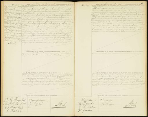 No. 133 No. 133 In vonnis der Arrondissenent Rechtbank te Haarlem van negenentwintig, December negen tienhonderd eenendertig is ontbinding door uitgesproben de echtscheiding van het in neven staande akte vermelde hunulyk ngentreven in het register van Heu welijken en Echt scheidingen mun- mer een, folio zeven te Imsterdam heden vijftien Januari negen- tienhonderd twee en dertig A.EZek Heden achttien maart negentienhonderd zes en twintig zijn voor mij Ambtenaar van den burgerlijken stand van Amsterdam verschenen, ten einde een huwelijk aan te gaan. Syme Gerrit Hogenbirk handels, reiziger, geboren en wonende alhier, ong achtentwintig jaren, meerderjarige zoon van Gerrit Jan Hogenbirk, oud vijftig jaren, — diamantslijper, en atharina Fabré, oud achten veertig ja ren, zonderberoep, beiden wonende alhier en Erika Agathe Hedwig Marie Past, zetwinkelierster, geboren te sterna inzuitschland, wonende in de gemeente Haarlem, oud vifentwin „tig jaren, Duitsche, meerderjarige dochter „ van Max Eduard Fast, overleden en Anna Minna Louise Auguste Muller zonder beroep, wonende te Monschan inzuitschland. De ouders des bruiden soms verklaarden, voor mij tegenwoor dig, toe te stemmen in dezen echt- De afkondiging tot dit huwelijk is onverhinderd geschied, alhier en in de gemeente Haarlem, den zevenentwin tigsten Februari laatstleden Ik heb bruidegom en bruid afgevraagd of zij elkander nemen tot echtgenooten en getrouwelijk alle de plichten zullen vervullen, welke door de wet aan den huwelijken staat verbonden zijn. Nadat deze vragen door hen bevestigend beantwoord werden, heb ik, in naam der wet, uitspraak gedaan, dat zij door het huwelijk aan elkander zijn verbonden. Als getuigen waren tegenwoordig: Magnus Pillmann handelsagent, oud zestig jaren, en Jan Hogenbirk, broeder des echtge„ noots, handelseiziger, oud negenen twintig jaren, beiden wonende alhier Waarvan akte, welke overeenkomstig de wet is voorgelezen. No. 134 Heden achttien Maart negentienhonderd zes en twintig zijn voor mij Ambtenaar van den burgerlijken stand van Amsterdam verschenen, ten einde een: huwelijk aan te gaan Ibert Jansen, winkelier, geboren en wonende alhier, oud achtentwintig jaren meerderjarige zoon van Evert Jansen, en Maria Helena Koster, beiden overleden, en Willemina Boonstra, zonder beroep geboren en wonende alhier, oud twee en twintig jaren, meerderjarige dochter van Tjabel Boonstra, oud vierenzestig jaren, - en Willemina Pieters oud eenen zestig jaren, - beiden zonderberoep en wonende alhier. De ouders derbruid ver klaarden, voor mij tegenwoordig, toe te stemmen indezen echt De afkondiging tot dit huwelijk is onverhinderd geschied, alhier den zeeden dezer maand Ik heb bruidegom en bruid afgevraagd of zij elkander nemen tot echtgenooten en getrouwelijk alle de plichten zullen vervullen, welke door de wet aan den huwelijken staa verbonden zijn. Nadat deze vragen door hen bevestigend beantwoord werden, heb ik, in naam der wet, uitspraak gedaan, dat zij door het huwelijk aan elkander zijn verbonden. Als getuigen waren tegenwoordig: Hendrik Roonstra, broe der der echtgenoote, drogist, oud drie en dertig jaren, en Johan Christiaan Wahlen zwager des echtgenoots, winkelier ou vier endertig jaren, beiden wonende alhier welke overeenkon 's voorgelezen Wapnyfillman T. G. Hogenhat R H H. M. Past Jan Rozenberk AVZahy G. J Hrgenbuk C Fabré BJonsen H Boonstra W Bronsta J. C. SWakt AWZaken J Boonstra W Liesters