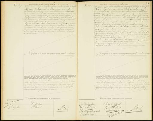 No. 130 Heden vierentwintig Maart negentienhonderd zes en twintig zijn voor mij Ambtenaar van den burgerlijken stand van Amsterdam verschenen, ten einde een huwelijk aan te gaan Petrus Johannes Burie, winkelier geboren in de gemeente Nieuwer-Amstel, wonende alhier, oud twee en dertig Ja ren, meerderjarige zoon van Petrus Johannes Burie, en Johanna Wilhelmis Blaauw, beidenzonder beroep en wo nende alhier, en Cornelia Catharina Spec, zonder beroep, geboren indegemeente Helder wonende alhier, oud zesentwintig jaren, meerderjarige dochter van Arie Spec, en Geertrui Everts, beiden overleden De afkondiging tot dit huwelijk is onverhinderd geschied, alhier den dertien den dezer maand Ik heb bruidegom en bruid afgevraagd of zij elkander nemen tot echtgenooten en getrouwelijk alle de plichten zullen vervullen, welke door de wet aan den huwelijken staat verbonden zijn. Nadat deze vragen door hen bevestigend beantwoord werden, heb ik, in naam der wet, uitspraak gedaan, dat zij door het huwelijk aan elkander zijn verbonden. Als getuigen waren tegenwoordig: Hermanus Spec, broeder der echtgenoote, timmerman, wonen de alhier, en Hermanus Everts, neef der echtgenoote, bankwerker, wonen de inde gemeente Rotterdam, beiden eenentwintig jaren oud No. 140 Heden vierentwintig Maart negentig zijn voor mij Ambtenaar van den burgerlijken stand van Amsterdam verschenen, ten einde een huwelijk aan te gaan: Jacob Antoon van Blijenburgh, metselaar, geboren enwonende alhier oud twintig jaren, minderjarige zoon van Willem van Blyenburgh, oud vyfenvyftig jaren, bezoldigd bestuurder eener vakvereeniging, en Petronella Baar spul, oud vijfenvijftig jaren, zonder be roep, beiden wonende alhier, en Hemmechiena Eelbrendina de la Court, zonder beroep, geboren en wonend alhier, oud twintig Jjaren, minderjarig dochter van Frederik Hendrik de la Court, oud vijfenveertig jaren timmerma en Grietje Roerts, oud vieren veertig ja ren, zonderberoep, beiden wonende al hier. Beider ouders verklaarden, voor mij tegenwoordig, toe te stemmen in dezen echt De afkondiging tot dit huwelijk is onverhinderd geschied, alhier Hendertien den dezer maand Ik heb bruidegom en bruid afgevraagd of zij elkander nemen tot echtgenooten en getrouwelijk alle de plichten zullen vervullen, welke door de wet aan den huwelijken staat verbonden zijn. Nadat deze vragen door hen bevestigend beantwoord werden, heb ik, in naam der wet, uitspraak gedaan, dat zij door het huwelijk aan elkander zijn verbonden. Als getuigen waren tegenwoordig: Anton Beylevels, zwager der echtgenoote, kantoorbediende, oud zesentwintig jaren, en Harmannus Roert de la Court, broeder der echtgenoote kantoorbediende, oud drie entwintig Jaren, beiden wonende alhier Waarvan akte, welke overeenkomstig de wet is voorgelezen. JBune H. Spee H Barts. ESpW Avzahy WH. de la Courb A. v. Blijenburgh G. Hverts H E. de labourt A:V Zahy A Britenr W: v. Blijenburg