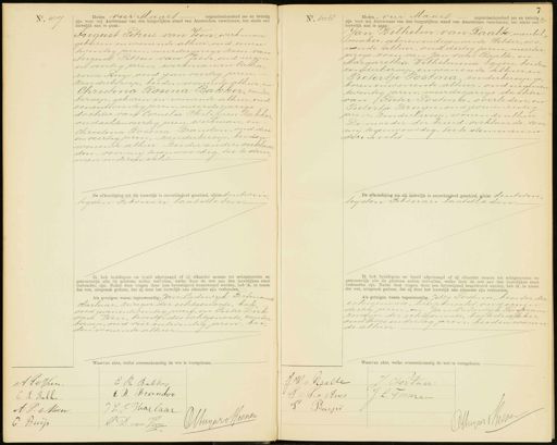 No. 107 Heden vier Maart honderd zes en twintig zijn voor mij Ambtenaar van den burgerlijken stand van Amsterdam verschenen, ten einde een huwelijk aan te gaan. August Petrus van Veen, werkman. geboren en wonende alhier, oud eenen twintig jaren, meerderjarige zoon van August Petrus van Veen, oud negen en veertig jaren, werkman, en Catha rina Ruys, oud zesen veertig jaren zonder beroep, beiden wonende alhier, en Christina Rosina Bakker, zonder beroep, geboren en wonende alhier, oud eenentwintig jaren, meerderjarige dochter van Cornelis Philiprus Bakker oud achtenveertig jaren, werkman, en Christina Rocna Brandon, oud drie en veertig jaren, - zonder beroep, beiden wonende alhier. Berder ouders verklard den, voor mij tegenwoordig, toe te stem men in dezen echt De afkondiging tot dit huwelijk is onverhinderd geschied, alhier rentwin tigsten Februari laatstleden. Ik heb bruidegom en bruid afgevraagd of zij elkander nemen tot echtgenooten en getrouwelijk alle de plichten zullen vervullen, welke door de wet aan den huwelijken staat verbonden zijn. Nadat deze vragen door hen bevestigend beantwoord werden, heb ik, in naam der wet, uitspraak gedaan, dat zij door het huwelijk aan elkander zijn verbonden. Als getuigen waren tegenwoordig: Jan Lodewijk Ferdinand Harlaar, zwager der echtgenoote, kok„ oud zevenentwintig jaren, en Pieter Dirk van Veen, broeder des echtgenoots, zonder beroep, oud vier entwintig jaren, bei den wonende alhier. Waarvan akte, welke overeenkomstig de wet is voorgelezen. No. 108 Heden vier Maart zijn voor mij Ambtenaar van den burgerlijken stand van Amsterdam verschenen, ten einde een huwelijk aan te gaan Jan Wilhelm van Raalte,meubel Smaker, geboren inde gemeente Helder, wo nende alhier, oud dertig jaren, meerder jarige zoon van Jan van Raalte, en Margaretha Wilhelmina Eggen, beiden zonder beroep, en wonende alhier, en Pietertje Sostma, zonder beroep, ge boren enwonende alhier, oud negenen twintig jaren, meerderjarige dochter van Pieter Postma, overleden, en Pietertje Bruyn, oud zevenenzestig jaren, zonder beroep, wonende alhier De moeder der bruid, verklaarde, voor mij tegenwoordig, toe te stemmen in dezen echt De afkondiging tot dit huwelijk is onverhinderd geschied, alhier dentidin tigsten Februari laatstieden. Ik heb bruidegom en bruid afgevraagd of zij elkander nemen tot echtgenooten en getrouwelijk alle de plichten zullen vervullen, welke door de wet aan den huwelijken staat verbonden zijn. Nadat deze vragen door hen bevestigend beantwoord werden, heb ik, in naam der wet, uitspraak gedaan, dat zij door het huwelijk aan elkander zijn verbonden. Als getuigen waren tegenwoordig: Jitze Iostma, broeder der echtgenoote, loopknecht, oud eenen dertig jaren, en Jan Lodewijk Iosseram zwager der echtgenoote boekdrukker oud twee endertig jaren, beiden wonen de alhier Waarvan akte, welke overeenkomstig de wet is voorgelezen C Pn Bakken A.F. v. Jeen ER Brandor C. H Bukker J L S Hailaar A P. v. Veen OHtugaro senen P.D. van Veen C Buijs J M v Raalte J Oortma S CPostma J. L. Gorseram